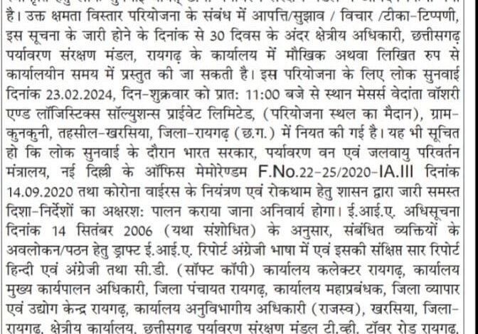 रायगढ़। जिले के इतिहास में कुनकुनी आदिवासी जमीन घोटाला एक ऐसा काला अध्याय है। जिसमें आदिवासियों को ठगी का शिकार बनाकर अवैध तरीके से जमीन छीन ली गई और उस पर वेदांत जैसी कंपनी बिठा दी गई । इस कंपनी ने पहले आदिवासियों की जमीन छीन कर उन्हें जमीन से बेदखल कर दिया अब यही कंपनी अपना विस्तार कर लोगों की सांस छिनने की तैयारी में है। मेसर्स वेदांता वाशरी एंड लॉजिस्टिक्स सॉल्यूशन प्राइवेट लिमिटेड नाम की यह कंपनी कुनकुनी में अपना 10 गुना विस्तार करने जा रही है, जिसकी जनसुनवाई जिला प्रशासन ने 23 फरवरी मुकर्रर की है। आलम यह है कि इस वेदांता के प्रदूषण के कारण वर्तमान में लोगों का जीना मुहाल है ऐसे में इस प्रदूषण वाले क्षेत्र में इसी उद्योग के विस्तार के लिए जिला प्रशासन लगा हुआ है। जिस तरह कुनकुनी घोटाला अधिकारियों के संरक्षण में हुआ कुछ इसी तरह इस बार भी जिला प्रशासन के अधिकारी संदेश के दायरे में हैं। वेदांता का विस्तार कुनकुनी के लोग नहीं चाहते लेकिन प्रशासन प्रदूषण के सारे मापदंडों को दरकिनार कर इस प्लांट के विस्तार में अपनी मुहर लग चुका है, जनसुनवाई तो महज औपचारिकता भर है। ऐसे में प्रदूषण के कारण गंभीर बीमारियों और समस्याओं से जूझ रहे लोग प्लांट के विस्तार से किस तरह जी पाएंगे यह एक सवाल है।