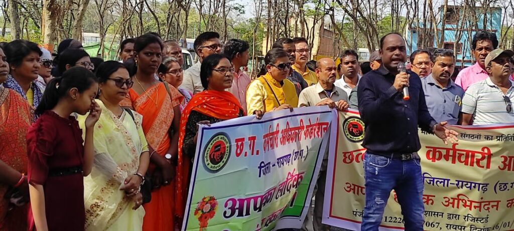 *रायगढ़ :- कर्मचारी हितों पर “मोदी की गारंटी” के अमल को लेकर छत्तीसगढ़ कर्मचारी अधिकारी फेडरेशन जिला रायगढ़ ने रैली निकालकर प्रदर्शन करते हुए माननीय मुख्यमंत्री छत्तीसगढ़ शासन श्री विष्णु देव साय जी के नाम कलेक्टोरेट रायगढ़ में डिप्टी कलेक्टर श्री महेश शर्मा को ध्यानाकर्षण ज्ञापन सौंपा। राज्य के कर्मचारी व पेंशनरों को केंद्र के समान चार प्रतिशत डीए देय तिथि से,घोषणा पत्र अनुसार जुलाई 2019 से लंबित डीए की एरिएर्स राशि को जीपीएफ खाते में समायोजित करने, वेतन विसंगति एवं अन्य मुद्दे के लिए गठित पिंगुआ कमेटी की रिपोर्ट सार्वजनिक करने व सातवें वेतनमान के एरियर्स की राशि की अंतिम 6 वीं किस्त का भुगतान शीघ्र किए जाने संबंधी अपनी चार सूत्रीय मांगों को लेकर आज छत्तीसगढ़ शासन द्वारा मान्यता प्राप्त संगठनों के प्रतिनिधि संगठन “छत्तीसगढ़ कर्मचारी अधिकारी फेडरेशन जिला रायगढ़” ने जिले के विभिन्न विभागों के सैकड़ों कर्मचारियों के साथ रैली निकालकर प्रदर्शन करते हुए अपनी आवाज बुलंद की।जिला फेडरेशन रायगढ़ के संयोजक श्री आशीष रंगारी ने कहा कि,”कर्मचारियों की सुधि