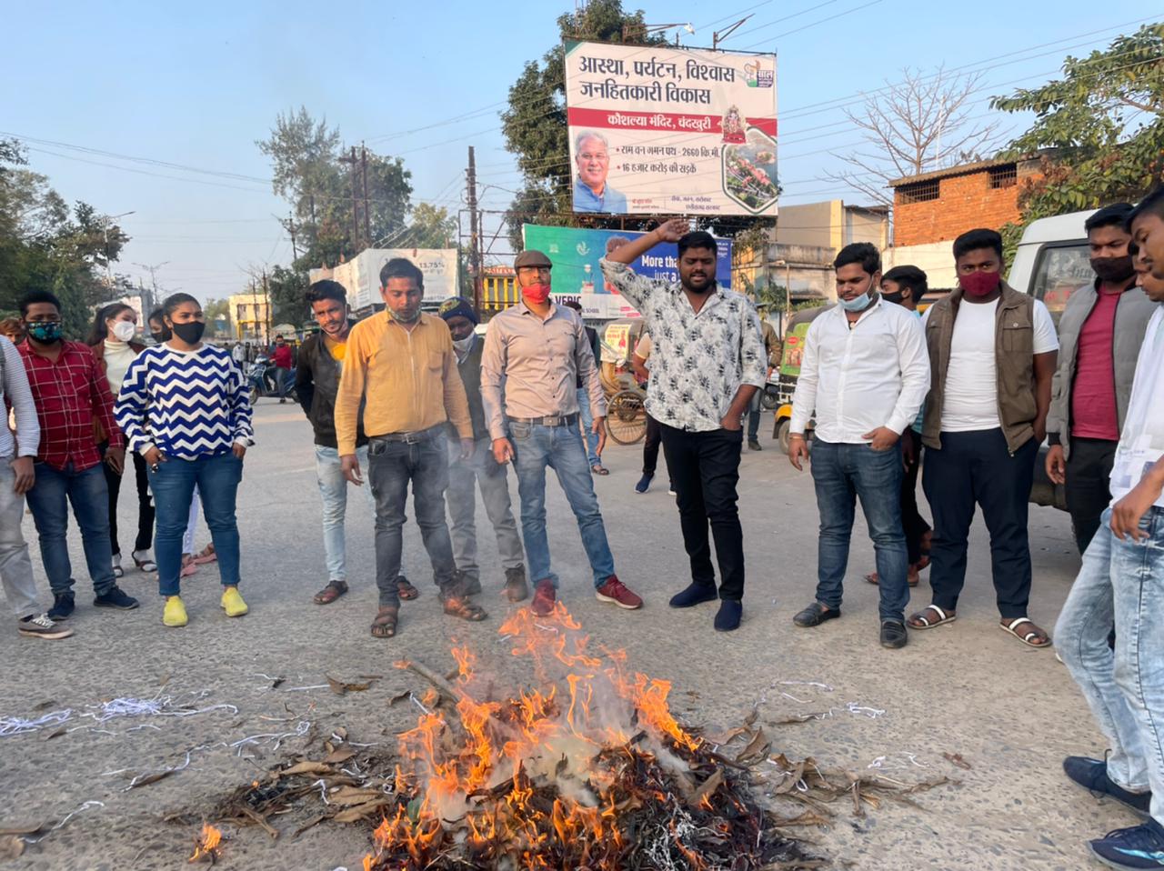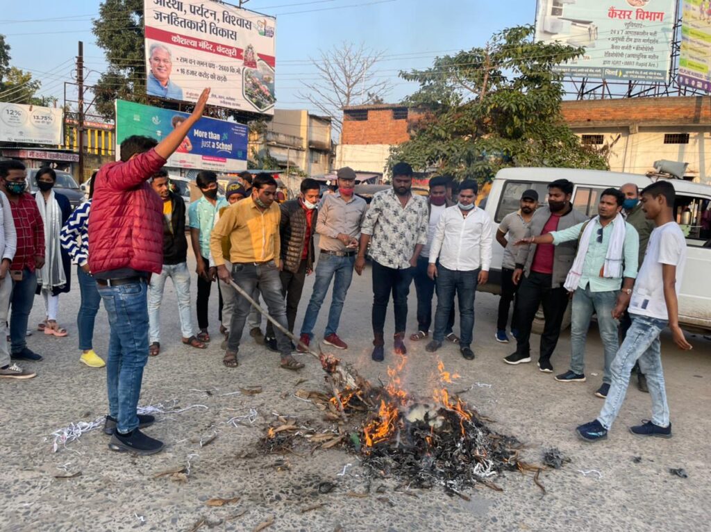 कल सोलह जनवरी को चुनाव आयोग की गाइडलाइंस के तहत भूपेश बघेल जी कांग्रेस प्रत्याशी पंखुड़ी पाठक का प्रचार कर रहे थे स्वाभाविक है मुख्यमंत्री के साथ उनकी सुरक्षा होती है साथ ही कांग्रेस के प्रति लोगो का रुझान जो कि खुद ब खुद भीड़ में तब्दील हो रहा है ऐसे में भूपेश बघेल जैसे लोकप्रिय नेता के खिलाफ मामला दर्ज किया जाना ये बीजेपी की बेतहाशा को बताता है इसी के खिलाफ रायगढ़ एन एस यु आई के कार्यकर्ताओं ने योगी आदित्यनाथ का स्टेशन चौक में पुतला दहन करके जोरदार नारेबाजी करते हुए योगी सरकार के इस कृत्य का विरोध किया।