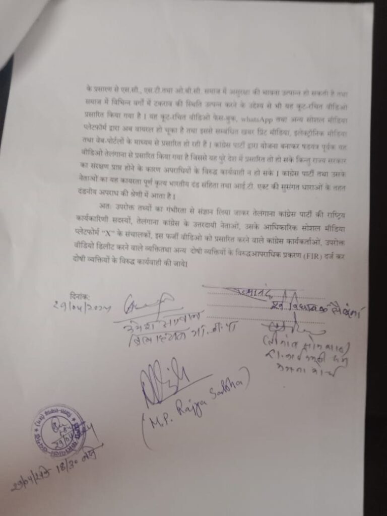कूटरचित वीडियो प्रसारित करने के मामले में तेलंगाना कांग्रेस के राष्ट्रीय कार्यकारिणी सदस्यों, तेलंगाना कांग्रेस के उत्तरदायी नेताओं, उसके आधिकारिक सोशल मीडिया प्लेटफोर्म ‘एक्स’ के संचालकों, इस फर्जी वीडियो को प्रसारित करने वाले कांग्रेस कार्यकर्ताओं, उपरोक्त वीडियो डिलीट करने वाले सभी संलिप्त दोषी व्यक्तियों एफआईआर दर्ज कर कड़ी कार्रवाई की मांग