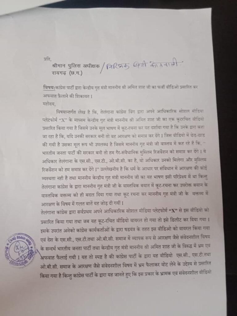 सत्यानंद राठिया,उमेश अग्रवाल,देवेंद्र प्रताप सिंह,श्रीकांत सोमावार,महेश साहू,मोहन कुर्रे ने पत्रकार वार्ता को संबोधित करते हुए कहा कि केन्द्रीय गृह मंत्री अमित शाह का यह कूटरचित वीडियो तेलंगाना कांग्रेस विंग द्वारा अपने आधिकारिक सोशल मीडिया प्लेटफोर्म ‘एक्स’ के माध्यम से प्रसारित किया गया है जिसमें उनके मूल भाषण में कूट-रचना कर यह दर्शाया गया है कि उनके द्वारा कहा जा रहा है कि, यदि उनकी सरकार बनी तो वह आरक्षण को समाप्त कर देंगे I भाजपा नेताओं ने कहा कि जिस वीडियो में छेड़-छाड़ की गई है, उसका मूल रूप भी उपलब्ध है जिसमें श्री शाह वास्तव में कह रहे हैं कि, “भारतीय जनता पार्टी की सरकार बनी तो हम गैर-संवैधानिक मुस्लिम रिजर्वेशन को समाप्त कर देंगेI यह अधिकार तेलंगाना के एस.सी., एस.टी., ओ.बी.सी. का है, वो अधिकार उनको मिलेगा और मुस्लिम रिजर्वेशन को हम समाप्त कर देंगेI” धर्म के आधार पर संविधान में आरक्षण की कोई व्यस्था नहीं है तथा केन्द्रीय गृह मंत्री श्री शाह का यह भाषण इसी परिप्रेक्ष्य में था, किन्तु तेलंगाना कांग्रेस के द्वारा वास्तविक बयान में कूट-रचना कर उपरोक्त बयान के वास्तविक वक्तव्य को ही बदल दिया गया तथा कूट रचना कर वक्तव्य में आरक्षण के विषय में गलत बातें जोड़कर जनता के बीच अफवाह फैलाने की निंदनीय हरकत की गई है।