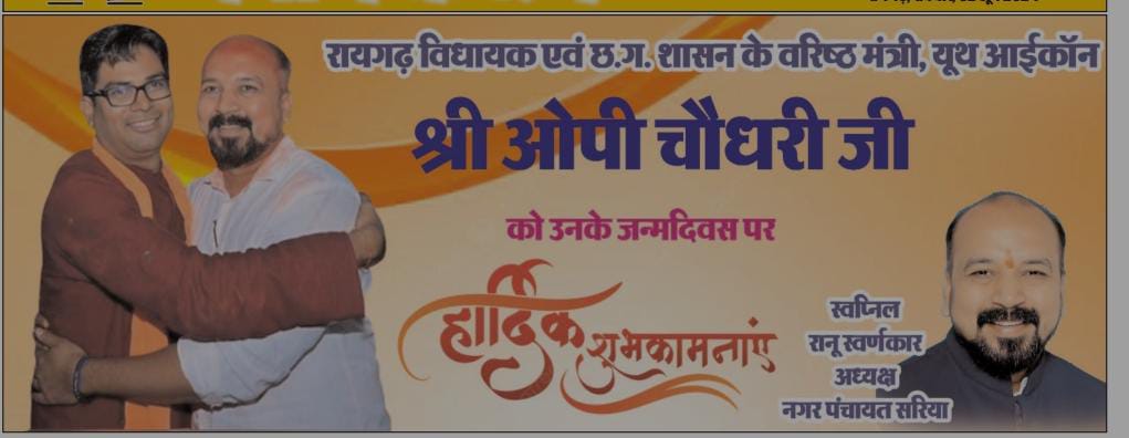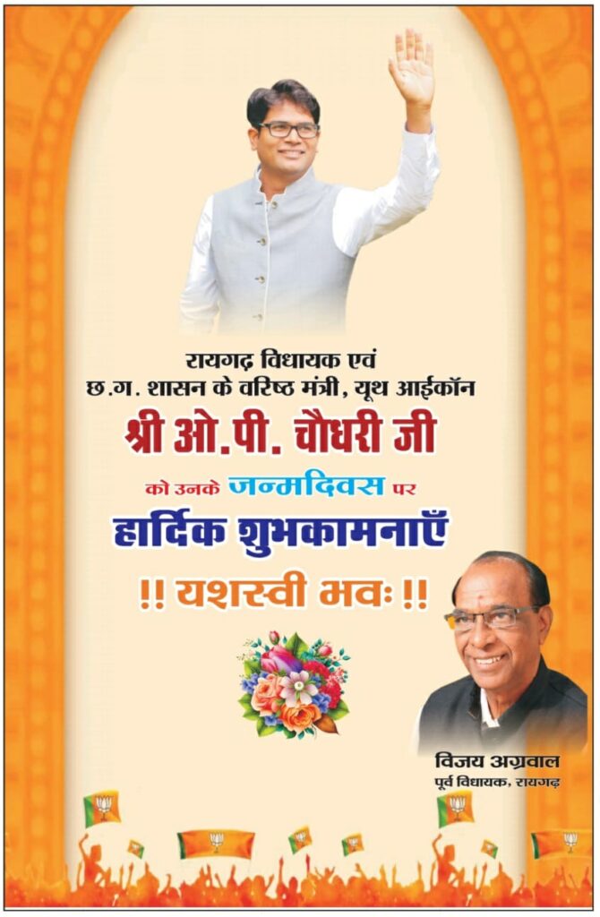 रायगढ़ :- मुख्यमंत्री विष्णुदेव साय ने अपने केबिनेट में साथी मंत्री ओपी चौधरी को जन्मदिन की बधाई देते हुए सीएम ने X पर लिखा, मंत्रिमंडल के मेरे साथी, रायगढ़ के लोकप्रिय विधायक ओपी चौधरी आपको जन्मदिन की हार्दिक बधाई एवं शुभकामनाएं। सत्यनारायण बाबा से आपके उत्तम स्वास्थ्य एवं दीर्घायु जीवन की कामना करता हूं। वही रमन सिंह ने ट्वीट पर छत्तीसगढ़ शासन में कैबिनेट मंत्री ओपी चौधरी को जन्मदिन पर हार्दिक बधाई और शुभकामनाएँ प्रेषित करते हुए ईश्वर से उत्तम स्वास्थ्य और सुदीर्घ जीवन की कामना की है। रमन सिंह ने कहा हमारे छत्तीसगढ़ को विकसित प्रदेश बनाने के दिशा में समर्पित होकर कार्य करते रहें। रायगढ़ कार्यालय में भी आज ओपी को उनके जन्मदिन पर बधाई देने का तांता लगा रहा।