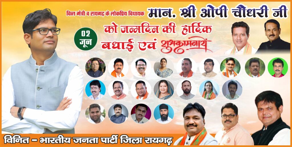 ओपी को जन्मदिन की बधाई देने आज पूरा शहर पोस्टर बैनर से पाट दिया गया। ओपी के जन्मदिन के दिन ही स्टेशन समीप नए कार्यालय में प्रवेश के साथ यह आम जनता के लिए लोकार्पित किया गया। नए कार्यालय में शहर वासी माटी पुत्र ओपी चौधरी को जन्मदिन की बधाई देने उमड़ पड़े।। प्रेरणा स्त्रोत यूथ आइकॉन ओपी चौधरी के 42 वे जन्मदिन पर नए विधायक कार्यालय में बधाई देने वालो में रायपुर संगठन के पदाधिकारी विधायक प्रदेश के सभी जिले से समर्थक रायगढ़ मंडल मोर्चा महिला मोर्चा युवा मोर्चा से जुड़े पदाधिकारी सरिया