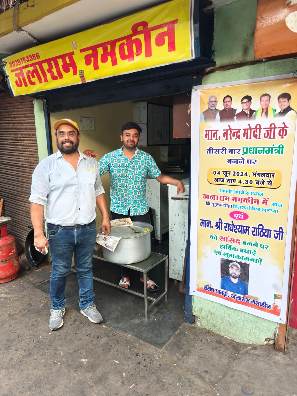 रायगढ़:- मोदी की जीत का जुनून सर चढ़ कर बोल रहा है। शहर की प्रतिष्ठित जलाराम नमकीन द्वारा मोदी जी के तीसरी बार प्रधान मंत्री बनने की खुशी में निःशुल्क पोहा वितरण किया जा रहा है। संचालक शैलेश चावड़ा बताते है कि उनके लिए नंबर मायने नहीं रखते लेकिन मोदी जी के तीसरी बार प्रधान मंत्री बनने की खबर से वे अपनी खुशी को रोक नहीं पाए और उन्होंने आज शाम निः शुल्क पोहा वितरण का निर्णय लिया। मोदी जी की जीत के पूर्वानुमान पर चर्चा के दौरान शैलेश ने