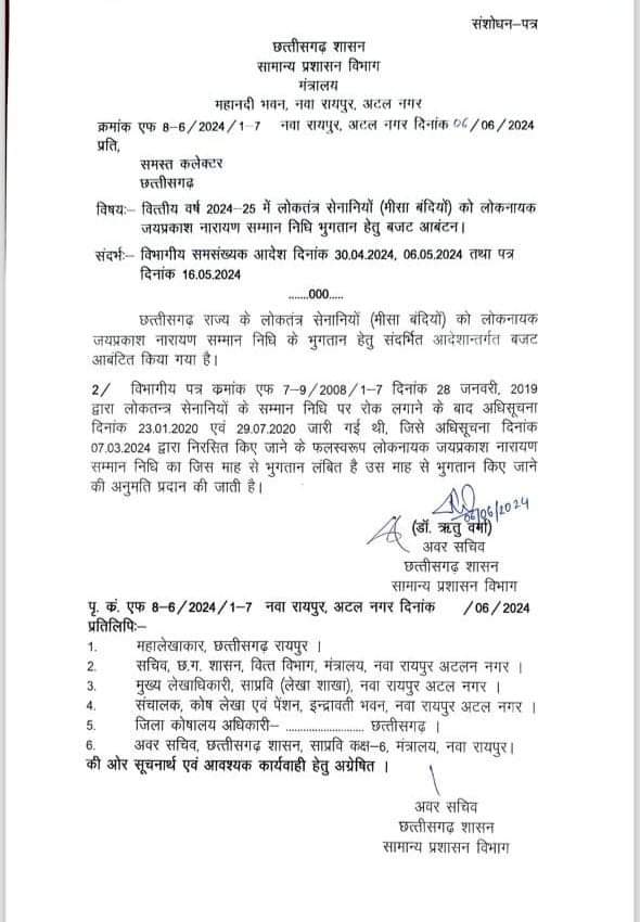 लगा दी गई थी। विष्णु देव साय सरकार ने लगी रोक को हटाते हुए पुनः बहाल करने हेतु 7 मार्च 2024 को अधिसूचना जारी किया था। अधिसूचना दिनांक से लंबित भुगतान के लिए सरकार ने बजट आबंटन का आदेश भी जारी कर दिया है। आपातकाल के दौरान जनतंत्र की पुनर्स्थापना के लिए महान विभूतियों के संघर्ष को प्रेरणादाई बताते हुए वित्त मंत्री ओपी ने कहा मीसा बंदियों का सम्मान विष्णु देव साय सरकार की प्राथमिकता है।