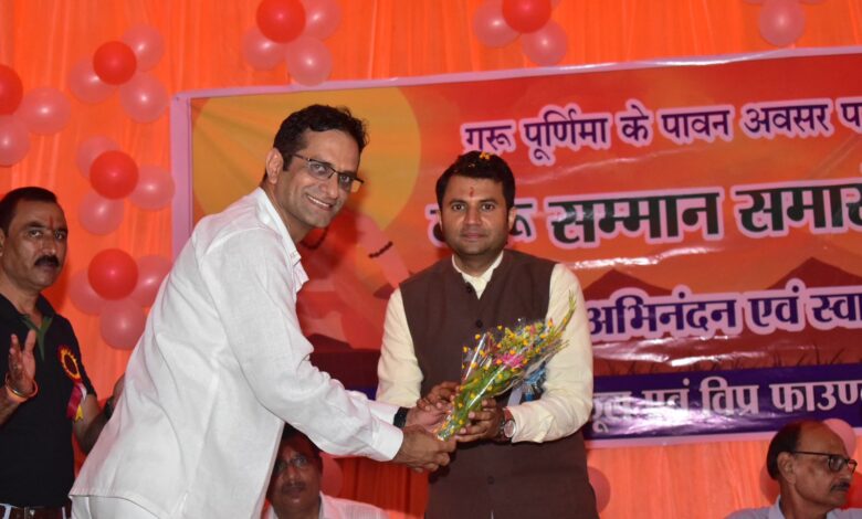 रायगढ़। गुरू पूर्णिमा के पावन अवसर पर संस्कार पब्लिक स्कूल एवं विप्र फाउंडेशन के संयुक्त आयोजन में विभिन्न विधाओं के सैंकड़ों गुरूजनों का सम्मान समारोह आयोजित किया गया। संस्था की प्राचार्या श्रीमती रश्मि शर्मा एवं विप्र फाउंडेशन के जिलाध्यक्ष विजय शर्मा मार्बल, कार्यक्रम के सदस्य आशीष रंगारी ने बताया कि जिला कलेक्टर कार्तिकेय गोयल, सेवानिवृत्त प्रो. महेन्दर सिंह खनूजा, सेवानिवृत्त प्राचार्या श्रीमती जया षड़ंगी, डिग्री कॉलेज विज्ञान विभाग प्रमुख आर.के.तंबोली, शिक्षा विभाग के आलोक स्वर्णकार, भूनेश्वर पटेल, विप्र फाउंडेशन के राष्ट्रीय कार्यकारिणी सदस्य रामचन्द्र शर्मा, सीपी देवांगन, अबरार हुसैन, विप्र फाउंडेशन के विजय शर्मा, राजेश शर्मा आदि के आतिथ्य में शिक्षक सम्मान समारोह स्थानीय पॉलिटेक्निक ऑडिटोरियम में गुरूपूर्णिमा के अवसर पर आयोजित किया गया। कार्यक्रम के आरंभ में माँ सरस्वती की मूर्ति पर दीप प्रज्जवलन किया गया। अतिथियों के सम्मान पश्चात करीब 300 सौं शिक्षकों को मोमेंटो एवं प्रमाण पत्र से सम्मानित किया गया। कार्यक्रम का शानदार संचालन श्रीमती भावना शर्मा एवं आशीष रंगारी ने किया। अंत में आभार प्रदर्शन चतुर्भूज पटेल ने किया।