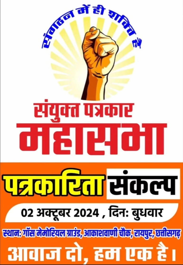 रायपुर:साथियों 02अक्टूबर 2024 को रायपुर आकाशवाणी चौक के पास स्थित गाँस मेमोरियल ग्राउंड में छत्तीसगढ़ के पत्रकारों के हित संवर्धन हेतु समस्त पत्रकार संघों के द्वारा संयुक्त पत्रकार महासभा का आयोजन किया जा रहा है। जो छत्तीसगढ़ में पत्रकारिता एवं पत्रकारों के भविष्य के लिए मील का पत्थर साबित होगा।