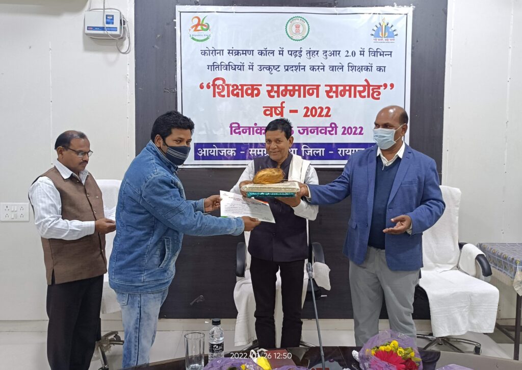 सुनिश्चित करने वाले शिक्षक एवं शिक्षिकाओं को गणतंत्र दिवस 26 जनवरी 2022 के दिन सम्मानित किए जाने का निर्देश था। इसी अनुक्रम में रायगढ़ जिले में प्रत्येक विकास खंड से ऐसे चार श्रेष्ठ शिक्षक-शिक्षिकाएं जिन्होंने पढ़ई तुंहर दुआर 2.0, विभिन्न नवाचारी गतिविधियों के क्रियान्वयन तथा सीजी स्कूल वेबसाइट के हमारे नायक कॉलम में अपना स्थान सुनिश्चित किया था उनका चयन विकासखंड स्तर पर गठित पुरस्कार चयन समिति द्वारा किया गया। 73 वें गणतंत्र दिवस को सम्मानित सभी शिक्षक-शिक्षिकाओं को शाल, श्रीफल, कलम व डायरी भेंट कर उन्हें उनके उत्कृष्ट कार्य हेतु उन्हें सम्मानित किया गया। इस अवसर पर जिला मिशन समग्र शिक्षा रायगढ़ के एपीसी श्री भुनेश्वर पटेल, श्री भूपेंद्र पटेल, श्री राम कुमार चौहान, श्री आलोक स्वर्णकार उपस्थित रहे।
