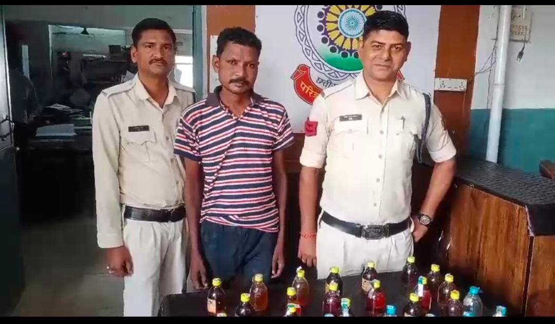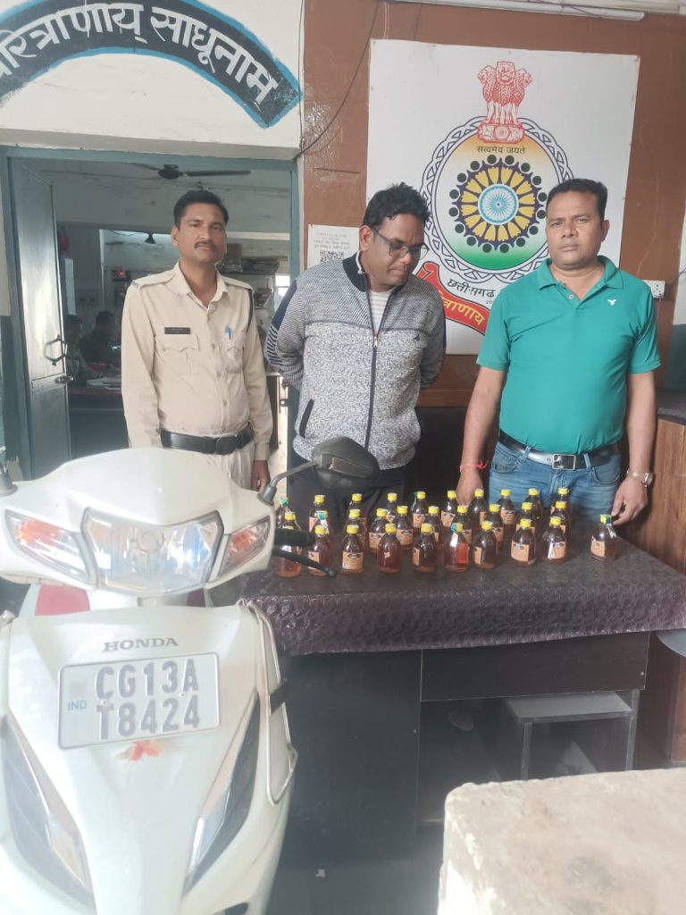 वहीं, दूसरी कार्रवाई में दुर्गा चौक के पास स्कूटी (CG 13 AT 8424) से *विजय टंडन पिता आंनद कुमार टंडन उम्र 38 वर्ष निवासी कयाघाट वार्ड क्र. 29 जूटमिल* को गिरफ्तार किया गया। उसकी स्कूटी की डिक्की से 30 पाव देशी शराब (5.400 लीटर) जब्त हुई। दोनों आरोपियों ने शराब को अवैध रूप से बेचने की बात स्वीकार की है। पुलिस ने आरोपियों पर आबकारी अधिनियम के तहत मामले दर्ज कर न्यायिक हिरासत में भेज दिया है। इस कार्रवाई में निरीक्षक मोहन भारद्वाज के साथ हमराह स्टाफ प्रधान आरक्षक सतीश पाठक, खीरेन्द्र जलतारे, आरक्षक तरुण महिलाने, सुशील यादव, जितेश चौहान और नरेश रजत की महत्वपूर्ण भूमिका रही। पुलिस की इस त्वरित कार्रवाई से क्षेत्र में अवैध शराब तस्करों के हौसले पस्त हुए हैं और स्थानीय लोगों ने इस पहल की सराहना की है। पुलिस ने साफ किया है कि अवैध गतिविधियों पर यह सख्ती लगातार जारी रहेगी।