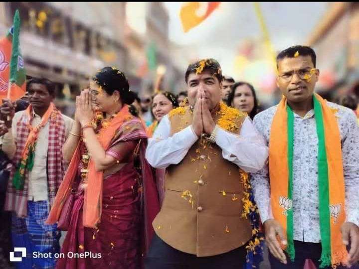 साथ कार्य की क्षमता है। रोड शो आज शक्ति गुड़ी चौक से प्रारम्भ हुआ खुली जीप पर सवार नेताओं पर रास्ते भर जनता फूलों की वर्षा करती रही जगह स्वागत द्वार सजाए गए थे दुल्हन की भांति सजे शहर का पूरा माहौल भाजपा मय हो गया। शक्ति गुड़ी चौक से रोड के आरंभ होते ही घड़ी चौक में बने मंच में वरिष्ठ भाजपा नेता सुभाष पांडे निर्विरोध निर्वाचित वार्ड नंबर 18 की प्रत्याशी पूर्व नेता प्रतिपक्ष पूनम पटेल सोलंकी