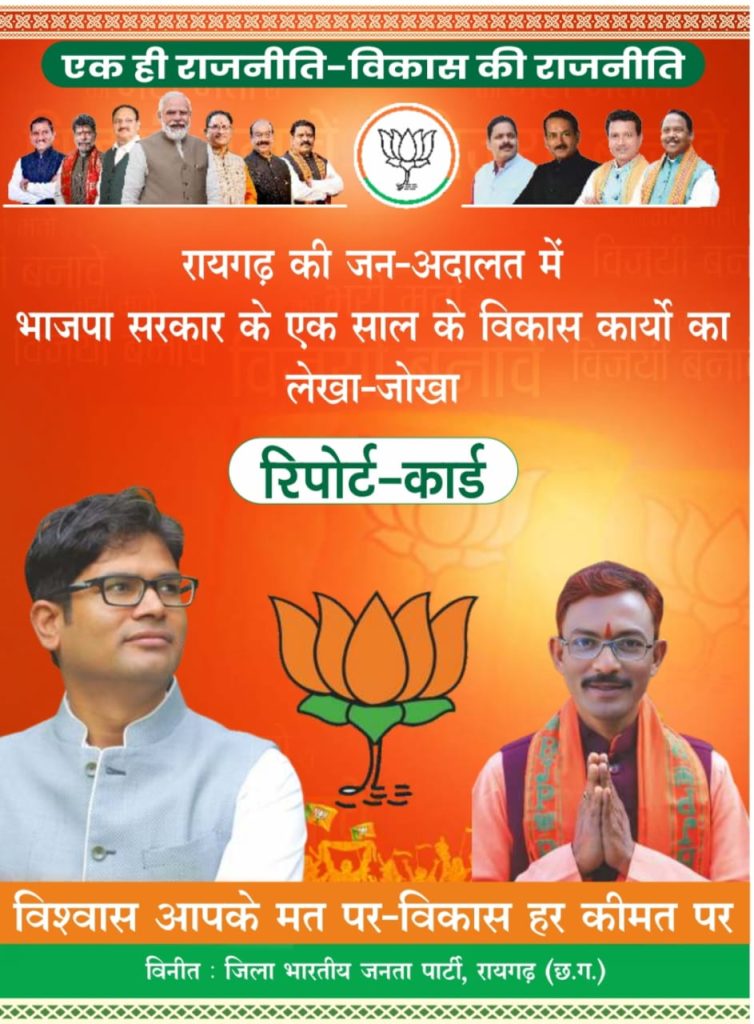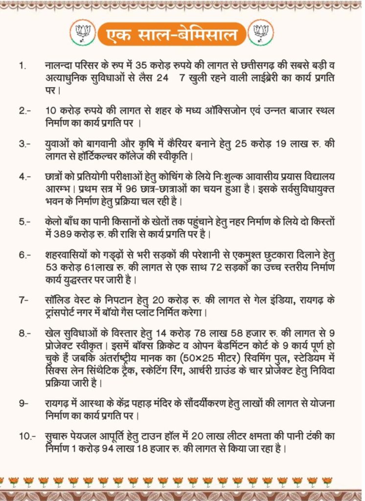 सकारात्मक होना जरूरी है। एक साल की उपलब्धियों को देखकर यह सहज अनुमान लग जाता है कि यदि नगर निगम में सहयोगी शहर सरकार होगी तो हमारा रायगढ़ विकास के उच्च शिखर को छू सकेगा।अतः आम जनता से विनम्र अपील है किआगामी नगर निगम चुनाव में महापौर पद हेतु जमीनी संघर्ष से निकले भाजपा प्रत्याशी जीवर्धन चौहान सहित पार्षद पद हेतु भाजपा प्रत्याशियों को चुनकर भेजें ताकि हम अनुकूल वातावरण में बिना अड़ंगेबाजी के तेज गति से काम करके रायगढ़ को एक स्वच्छ, सुविधाजनक व सुंदर शहर में तब्दील कर सकें। एक साल के विकास कार्यों का रिपोर्ट कार्ड निम्नानुसार है।