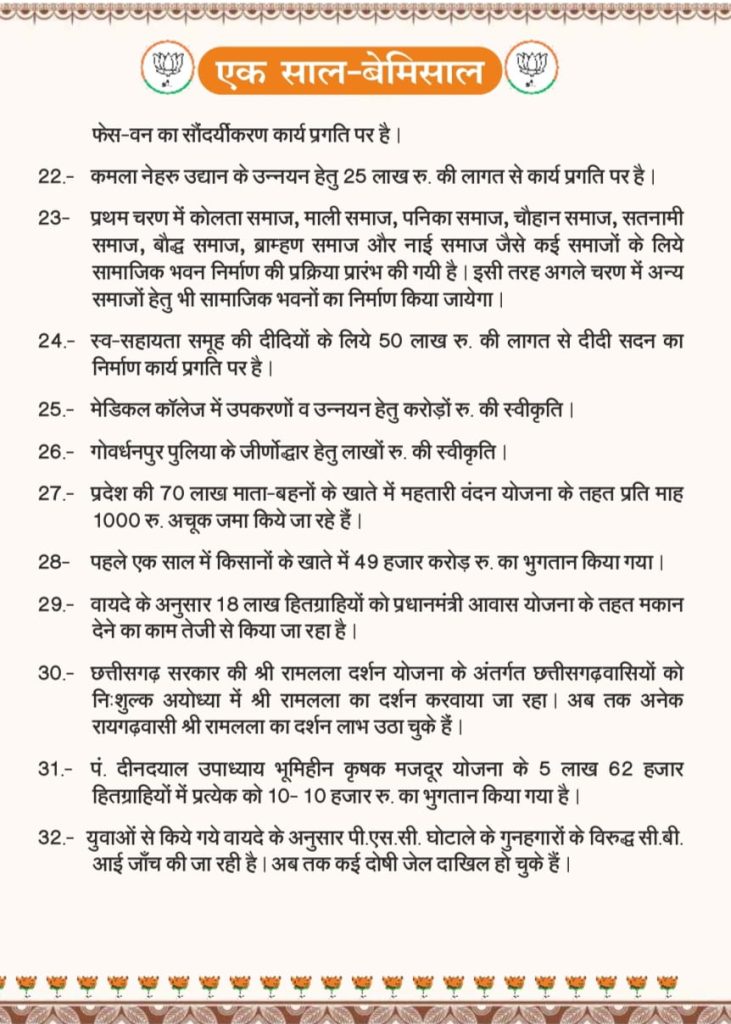 ओ.पी.चौधरी ने जन-अदालत में प्रस्तुत किया है। इसे देखने से यह स्पष्ट होता है कि विकास की दृष्टि से यह एक साल बेमिसाल रहा है। भाजपा सरकार अंचल के विकास के लिये एक बड़े विजन के साथ काम कर रही है। पिछले एक वर्ष का अनुभव यह बतलाता है कि नगर निगम में कांग्रेस की शहर सरकार राजनीतिक दुराग्रह के कारण अड़ंगेबाजी करके विकास कार्यों को बाधित करने की राजनीति करती रही है। इससे विकास की गति धीमी पड़ जाती है। निर्बाध और तेज गति से विकास को आगे बढ़ाने हेतु नगर निगम के वातावरण व कार्यप्रणाली का