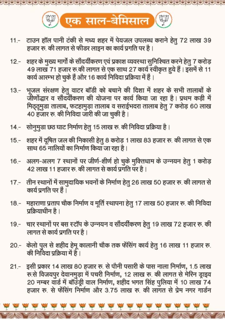 12.- शहर के मुख्य मार्गों के सौंदर्यीकरण एवं प्रकाश व्यवस्था सुनिश्चित करने हेतु 7 करोड़ 49 लाख 71 हजार रु.की लागत से एक साथ 27 कार्य स्वीकृत हुये हैं। इसमें से 11 कार्य आरम्भ हो चुके हैं और 16 कार्य निविदा प्रक्रिया में हैं।