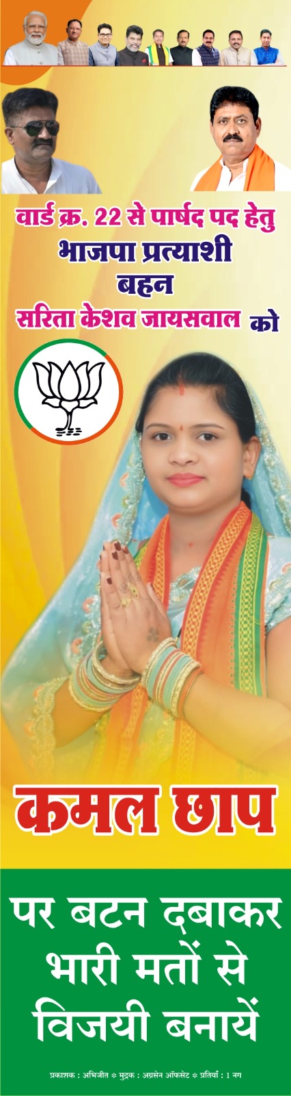 केशव जायसवाल परिसर की स्थापना, ऑक्सीजोन का निर्माण शहर के हर वार्ड की सड़कों का निर्माण,बिजली,पानी की बेहतर सुविधा का काम करवाया है।उसके बाद से जनता ने हर वार्ड में भाजपा प्रत्याशी को जीताने का मन बना लिया है।इसी वजह से वार्ड नं 22 के लोग भी मतदान के दिन भाजपा के पक्ष में मतदान कर मुझे विजयी बनायेंगे।