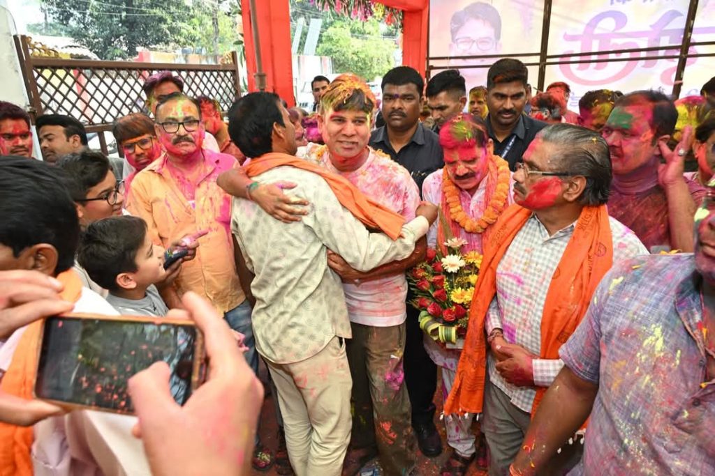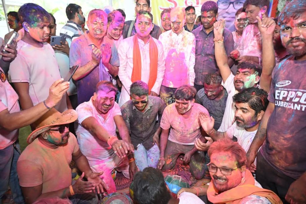रायगढ़ :-लाडले विधायक ओपी चौधरी के साथ उनके निवास में होली खेलने विधान सभा से भाजपा संगठन सहित निर्वाचित जन प्रतिनिधियों गणमान्यजनों की भीड़ उमड़ पड़ी। *महापौर जीवर्धन, सभापति डिग्री, पूर्व विधायक विजय,पूर्व जिलाध्यक्ष उमेश भी वित्त मंत्री ओपी के साथ होली के रंग में रंगे नजर आये।विधायक ओपी बड़ी आत्मीयता सादगी एवं निराले अंदाज में शहरवासियों के साथ नाचते थिरकते नजर आए। सभी अपने अपने अंदाज में विधायक के साथ होली खेलते रहे ।वही प्रगति बजट के फ्लैक्स जिसमें विधायक एवं वित्त मंत्री ओपी चौधरी की तस्वीर लगी हुई है लाडले