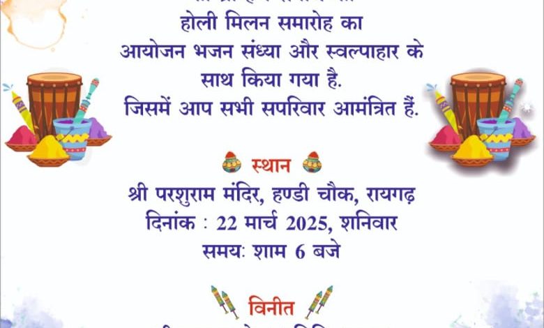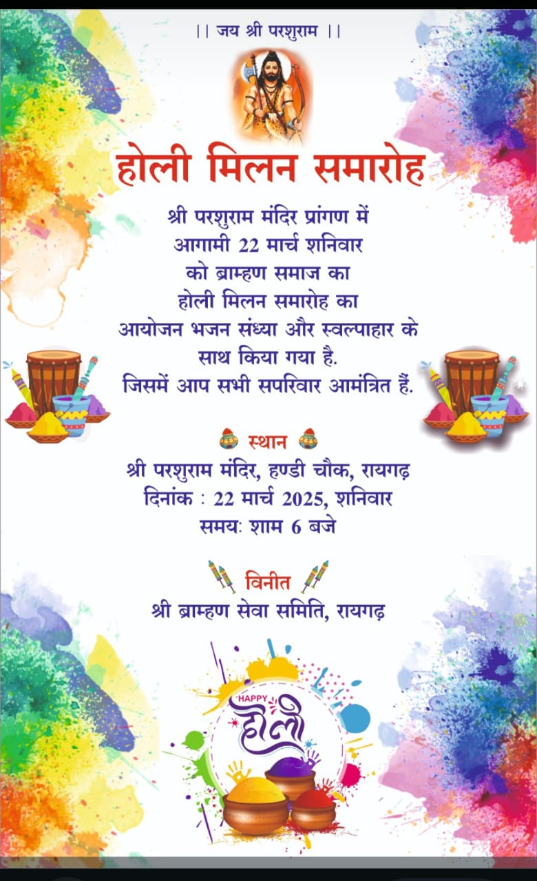 रायगढ़ – – शहर के हंडी चौक स्थित ब्राम्हणों के कुल देवता भगवान परशुराम जी मंदिर में होली पर्व और रंग पंचमी पर्व की खुशी में भव्य होली मिलन समारोह का आयोजन किया जाएगा। वहीं इस संबंध में ब्राह्मण सेवा समिति के अध्यक्ष प्रवीण शर्मा बताया कि यह होली मिलन समारोह का आयोजन 22 मार्च शनिवार को शाम छह बजे से होगा। सर्वप्रथम विधि विधान से सर्वप्रथम भगवान परशुराम जी की पूजा अर्चना की जाएगी। इसके पश्चात होली मिलन समारोह का आयोजन होगा। वहीं इस आयोजन के अंतर्गत भजन संध्या और स्वल्पाहार की भी व्यवस्था की गई है।