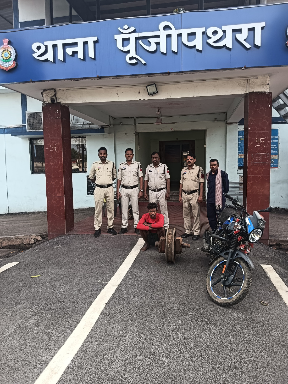 प्लांट के सिक्योरिटी इंचार्ज समर बहादुर ने 21 मार्च को थाना पूंजीपथरा में रिपोर्ट दर्ज कराई, जिसके आधार पर अपराध क्रमांक 63/2025 धारा 331 (4), 305 (E), 3(5) बी.एन.एस. के तहत मामला दर्ज कर जांच शुरू की गई। थाना प्रभारी निरीक्षक राकेश मिश्रा के नेतृत्व में पुलिस टीम ने त्वरित कार्रवाई करते हुए संदेही त्रिनाथ राठिया, निवासी कटाईपालीडीह, ग्राम तुमीडीह को हिरासत में लिया। पूछताछ में उसने अपने तीन साथियों के साथ मिलकर चोरी की वारदात को अंजाम देने और चोरी का सामान आपस में बांट लेने की बात स्वीकार की।