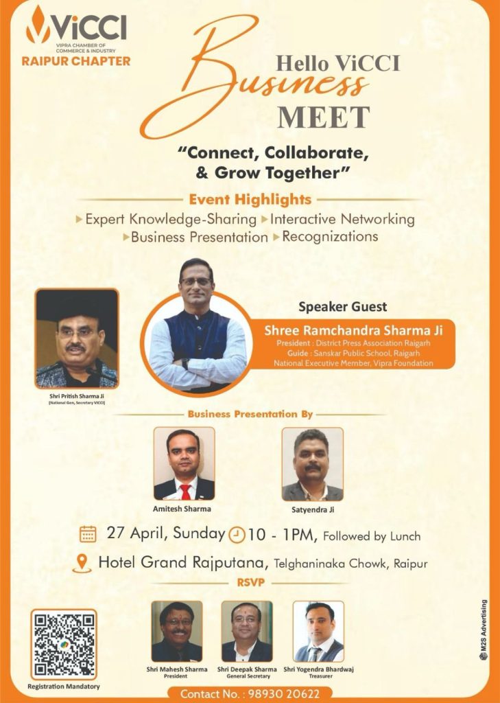 रायगढ़। विप्र चेंबर ऑफ कॉमर्स एन्ड इंडस्ट्री रायपुर द्वारा वी सी सी आई विक्की बिजनेस मीट का आयोजन रविवार 27 अप्रैल 2025 को प्रात: 10 बजे से होटल ग्रैंड राजपूताना तेलघानी नाका चौक रायपुर में किया जा रहा है। जिसमें उद्यमी अपने अनुभव साझा करेंगे व बिजनेस प्रेजेंटेशन देंगे। रायपुर में आयोजित होने वाले इस कार्यक्रम के विशेष अतिथि रायगढ़ के शिक्षाविद एवं मोटिवेटर रामचंद्र शर्मा स्पीकर के रूप में शामिल होंगे। ज्ञात हो कि रामचन्द्र शर्मा विभिन्न क्षेत्रों में सफलता का परचम लहरा चुके हैं। जिसमें सरकारी नौकरी के साथ-साथ व्यापार प्रबंधन, शैक्षणिक प्रबंधन, टीम लीडरशिप आदि में महारथ हासिल कर चुके हैं।उ वर्तमान में