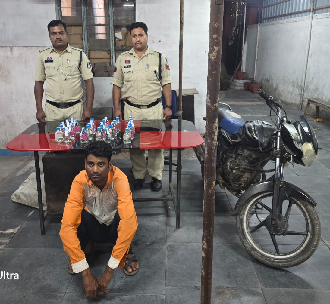 थाना प्रभारी जूटमिल निरीक्षक प्रशांत राव को सूचना मिली थी कि बस स्टैंड मटन मार्केट की ओर से एक व्यक्ति भारी मात्रा में शराब लेकर बिक्री हेतु जा रहा है। सूचना मिलते ही उन्होंने प्रधान आरक्षक शिव वर्मा को टीम के साथ कार्रवाई के निर्देश दिए। तत्परता दिखाते हुए पुलिस टीम ने दुर्गा चौक मिट्ठुमुड़ा पर घेराबंदी की और एक संदिग्ध व्यक्ति को रोककर जांच की। आरोपी खगेश्वर साव पिता घुरवा साव उम्र 32 वर्ष निवासी गढ़उमरिया थाना जुटमिल के पास से 30 पाव देशी प्लेन शराब, कुल 5 लीटर 400 मिलीलीटर बरामद की गई। साथ ही शराब ढोने में इस्तेमाल की जा रही काले रंग की TVS डिस्कवर मोटरसाइकिल (CG 13 UA 0754) भी जब्त की गई है।