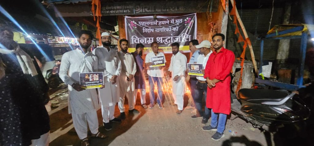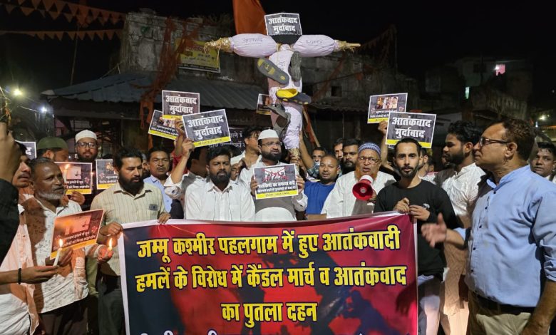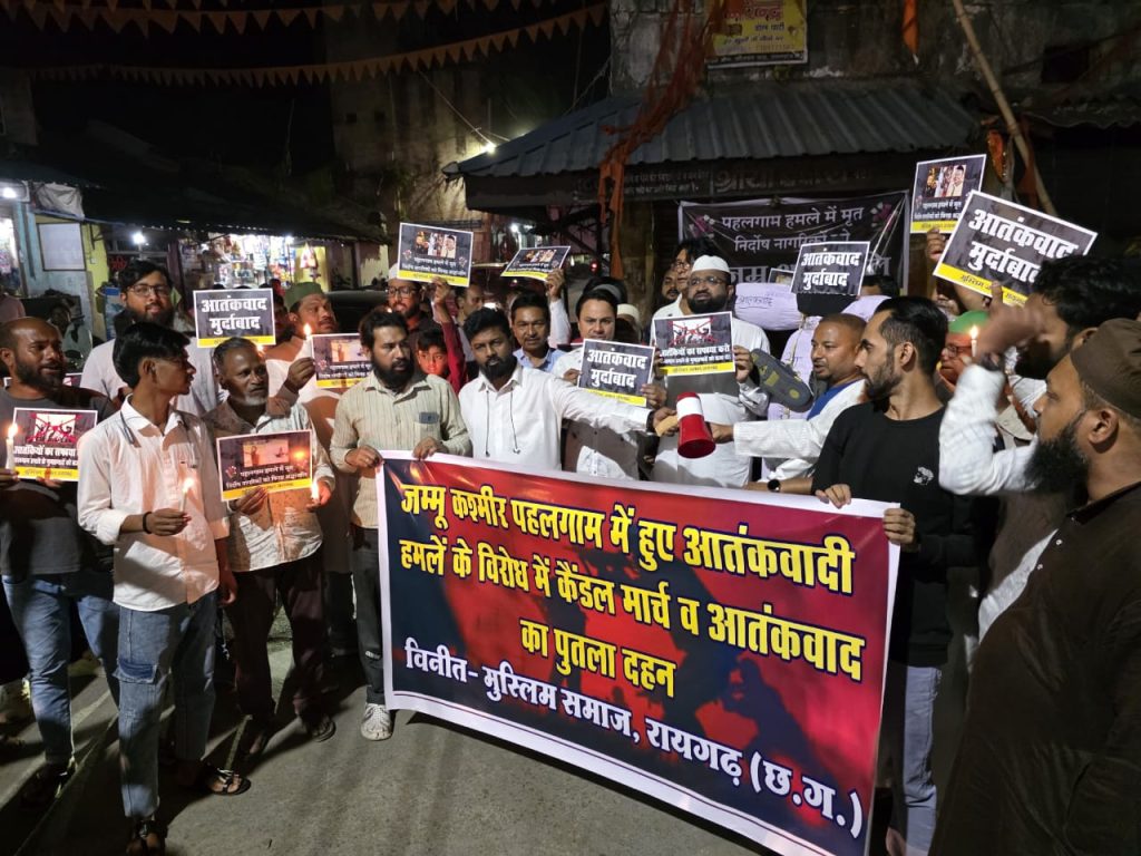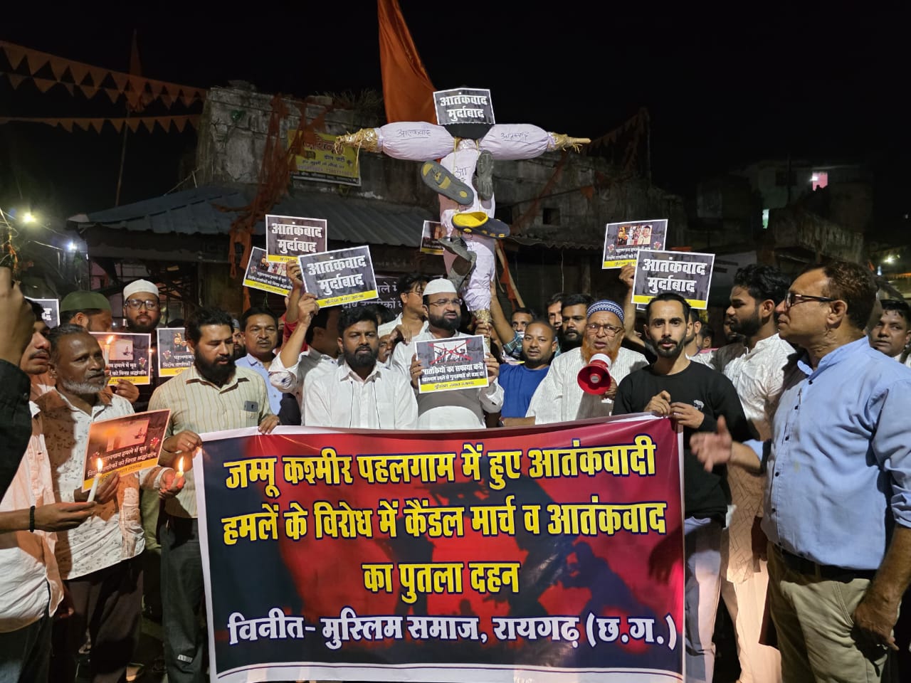 रायगढ़/जम्मू कश्मीर के पहलगाम में हुए आतंकी हमले का पुरजोर विरोध करते हुए मुस्लिम समाज रायगढ़ ने राजा महल से कैंडल मार्च निकाला और चांदनी चौक पहुंचकर आतंकवाद का पुतला दहन किया ,शहीद हुए निर्दोष नागरिकों को खिराजे अकीदत पेश करते हुए कहा इस कायराना हमले में हमारे हिन्दू भाइयों की