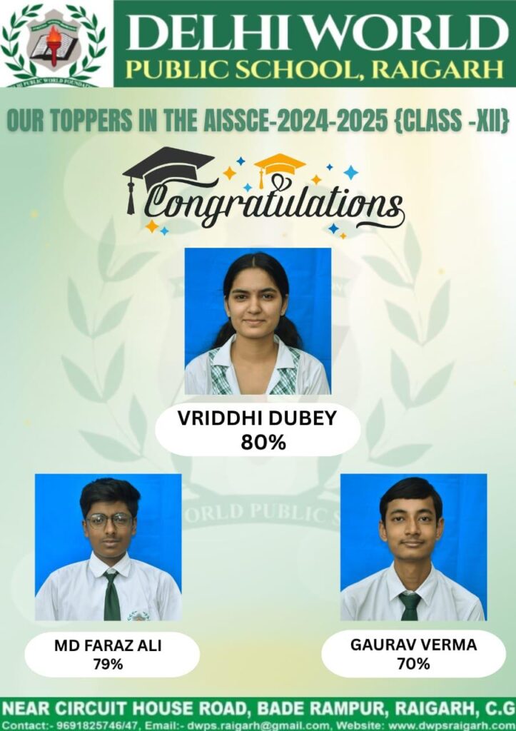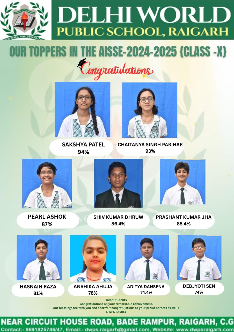रायगढ़ शहर क़े बड़े रामपुर में स्थित दिल्ली वर्ल्ड पब्लिक स्कूल क़े सी बी एस ई के दसवीं औऱ बारहवी का परीक्षा परिणाम 13 मई को घोषित हुआ जिसमें दसवीं का परीक्षा परिणाम शत प्रतिशत रहा । जिसमें साक्षया पटेल 94 प्रतिशत , चैतन्या सिंह परिहार 93 प्रतिशत, पर्ल अशोक 87 प्रतिशत, शिव कुमार ध्रुव 86.4 प्रतिशत, प्रशांत झा 85.4 प्रतिशत, हसनैन राजा 81 प्रतिशत, अंशिका आहुजा 78 प्रतिशत, आदित्य डनसेना 74.4 प्रतिशत, देबजोती सेन 74 प्रतिशत ने तो बारहवीं में गौरव वर्मा, वृद्धि दुबे, मोहम्मद फराज अली ने 2024-25 परीक्षा परिणाम में बाजी मारी…विद्यालय का परीक्षा परिणाम उत्कृष्ट रहा।