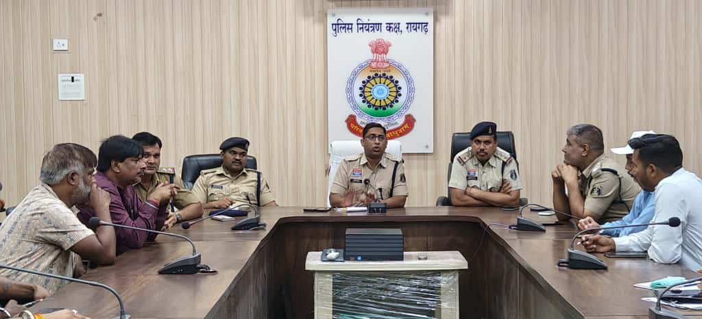 रायगढ़ । आज दिनांक 10 सितंबर को पुलिस कंट्रोल रूम रायगढ़ में प्रशासन, पुलिस और नगर निगम अधिकारियों की संयुक्त उपस्थिति में शहर के दुर्गा आयोजन समितियों के साथ शांति समिति की बैठक आयोजित की गई। बैठक की अध्यक्षता अतिरिक्त पुलिस अधीक्षक श्री आकाश मरकाम ने की। उन्होंने एक-एक कर सभी आयोजक समितियों से उनके कार्यक्रमों की जानकारी ली और माता दुर्गा की प्रतिमा स्थापना से लेकर विसर्जन तक की व्यवस्थाओं पर विस्तार से चर्चा की।