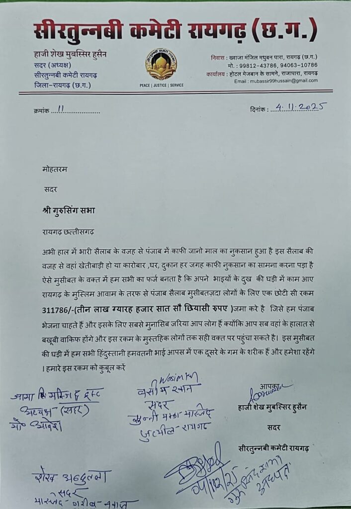 इस बारे सीरतुन्नबी कमेटी अध्यक्ष हाजी शेख मुबस्सिर हुसैन ने अपनी टीम के साथ बैठक बुलाया जिसमें तय किया गया कि रायगढ़ शहर में पंजाब सैलाब मुसीबतज़दा लोगों के लिए अपने कौम के लोगों से ज्यादा से ज्यादा रकम जमा की जाए और और कमेटी की इस पहल पर रायगढ़ के मुसलमानो दिल से साथ दिया।