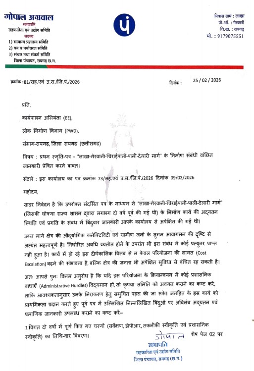 रायगढ़ जिले की महत्वपूर्ण सड़क परियोजना “लाखा–गेरवानी–चिराईपानी–पाली–देलारी मार्ग” के निर्माण में हो रहे विलंब को लेकर जिला पंचायत की सहकारिता एवं उद्योग समिति ने कड़ा रुख अपनाया है। समिति के सभापति श्री गोपाल अग्रवाल ने लोक निर्माण विभाग (PWD) के कार्यपालन अभियंता को प्रथम स्मृति-पत्र (Reminder) जारी कर 2 साल से अटकी इस परियोजना पर बिंदुवार जवाब मांगा है।