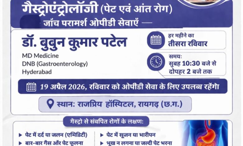 रायगढ़ के राजप्रिय हॉस्पिटल में पेट एवं लिवर से संबंधित बीमारियों के इलाज हेतु एक विशेष परामर्श शिविर का आयोजन किया जा रहा है। यह सुविधा विशेष रूप से उन मरीजों के लिए उपयोगी होगी जो लंबे समय से गैस, एसिडिटी, पेट दर्द, लिवर की समस्या या अन्य पाचन संबंधी परेशानियों से जूझ रहे हैं।