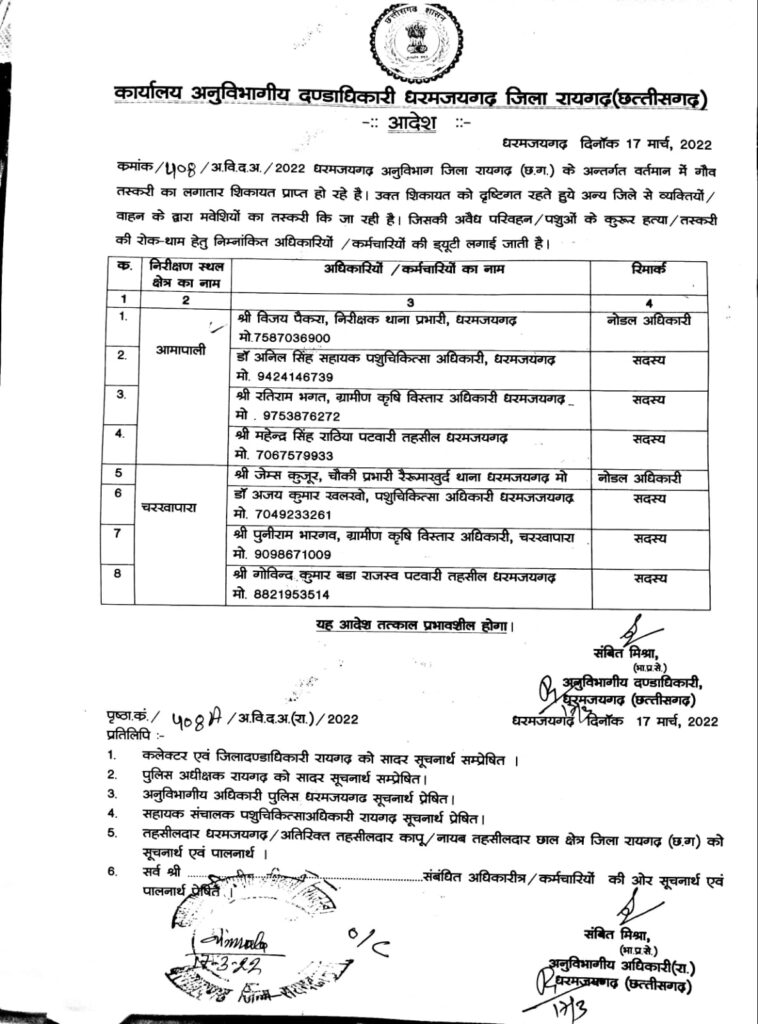 अनुविभागीय अधिकारी (राजस्व) धर्मजयगढ़ द्वारा गौ तस्करी की लगातार शिकायत होने पर 17 मार्च 2022 को धर्मजयगढ़ के आमापाली और चारखापारा मवेशी बाजार में गौतस्करी के रोकथाम के लिए अधिकारियों और कर्मचारियों की ड्यूटी लगाई थी जिसमे आमापाली में विजय पैकरा थाना प्रभारी धर्मजयगढ़ को नोडल अधिकारी, डॉ अनिल सिंह सहायक पशुचिकित्सक अधिकारी, रतिराम भगत ग्रामीण कृषि विस्तार अधिकारी,महेंद्र सिंह राठिया पटवारी ये सभी सदस्य थे वही चारखापारा के लिए जेम्स कुजूर चौकीप्रभारी रैरूमखुर्द को नोडल अधिकारी, अजय कुमार खलखो पशुचिकित्सक अधिकारी, पुनीराम भार्गव ग्रामीण कृषि विस्तार अधिकारी, गोविंद कुमार बड़ा राजस्व पटवारी ये सदस्यो की टीम है।