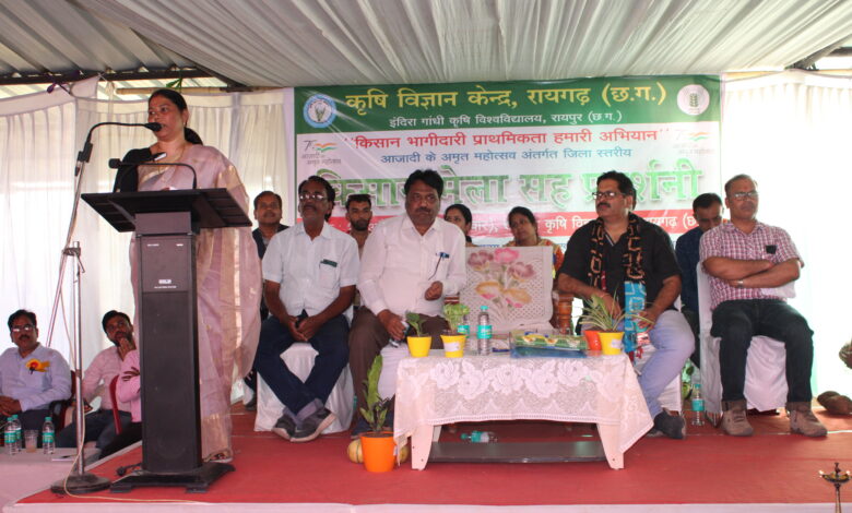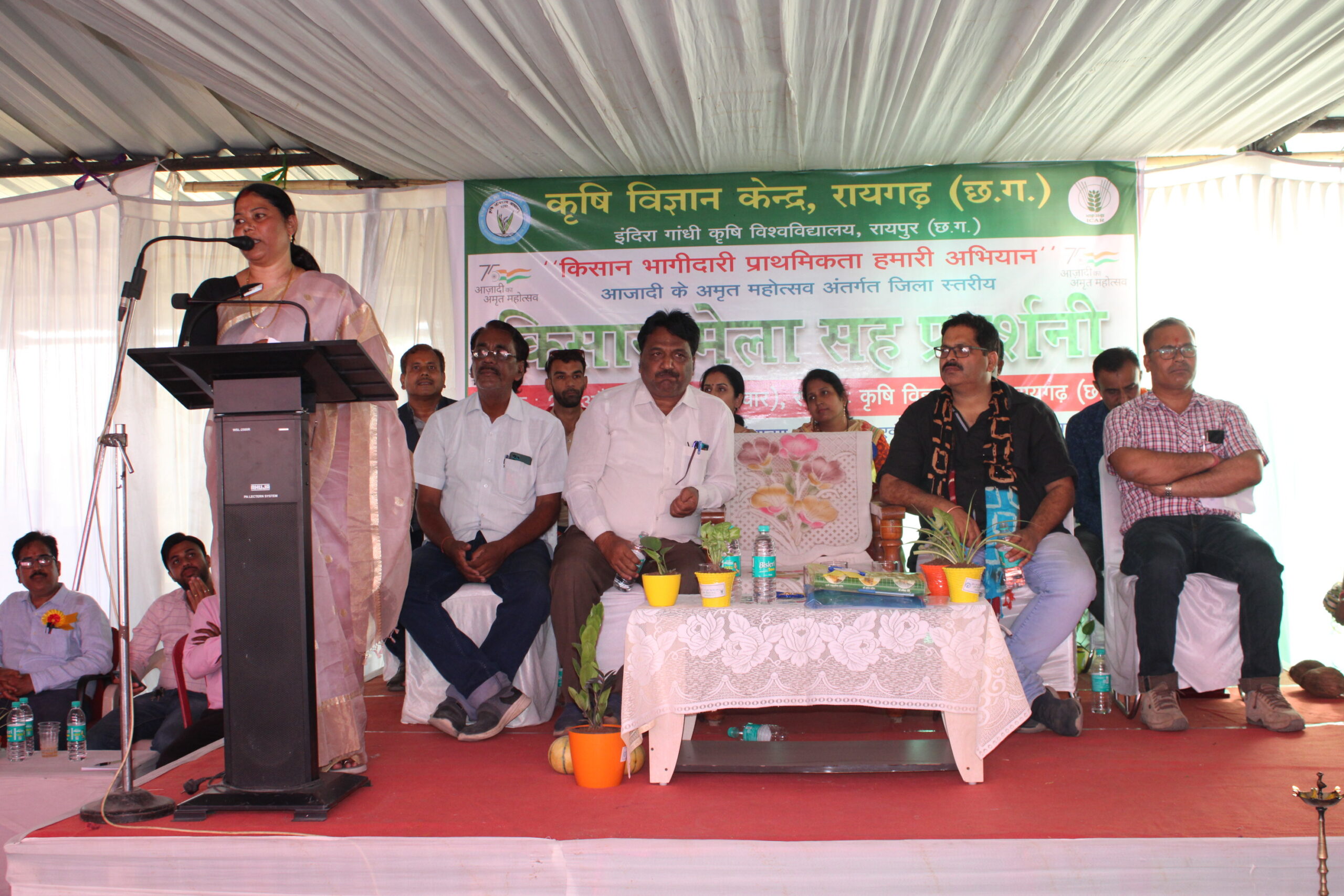 रायगढ़, / आजादी के अमृत महोत्सव के अंतर्गत सांसद गोमती साय के मुख्य आतिथ्य में कृषि विज्ञान केन्द्र रायगढ़ परिसर में प्राकृतिक खेती पर आधारित एक दिवसीय किसान मेला एवं कृषि प्रदर्शनी कार्यक्रम का आयोजन किया गया। सांसद साय ने कृषि विज्ञान केन्द्र प्रांगण में उन्नत किसानों द्वारा लगाये गए उत्कृष्ट कृषि उत्पादों की प्रदर्शनी का उद्घाटन करते हुए कृषकों की प्रशंसा की।