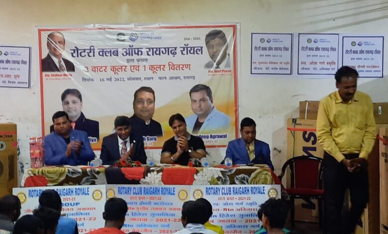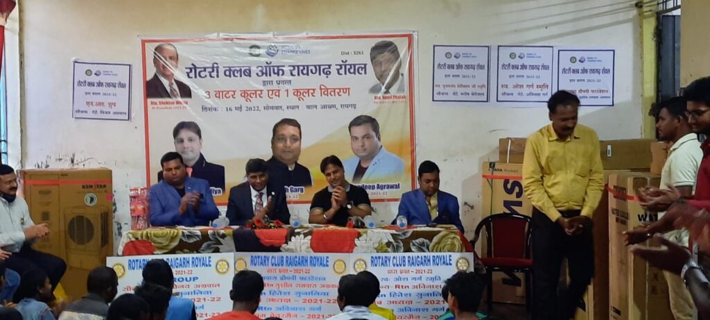 स्वच्छ और ठंडा पानी मिलेगा। वहीं डी.जी.एन.डी. अखिलेश मिश्रा ने सभा को सम्बोधित करते हुए कहा कि समाज में रोटरी क्लब ने अपने सेवा कार्यों के बल पर अपना नाम स्थापित किया है। उसके बाद क्लब अध्यक्ष हितेश सोनालिया और सचिव संदीप अग्रवाल ने भी सभा को सम्बोधित किया और रोटरी क्लब रायगढ़ रॉयल को लोगों के सेवा में समर्पित संस्थान बताया। इस कार्यक्रम से पूर्व होटल अंश इंटरनेशनल में रोटरी क्लब के डिस्ट्रिक गवर्नर का आधिकारिक विजिट कार्यक्रम का आयोजन किया गया था, जिसमें डी.जी. सुनील पाठक और डी.जी.एन.डी. अखिलेश मिश्रा को क्लब के पदाधिकारियों ने क्लब द्वारा किए गये पूरे वर्ष के सेवा कार्यों और गतिविधियों को बताया। इसके लिए डी.जी. और डी.जी.एन.डी. ने मुक्त कंठ से क्लब की प्रशंसा की। उक्त कार्यक्रम में चेयरमैन विजय अग्रवाल (एन. आर. इस्पात), डॉ. मनीष