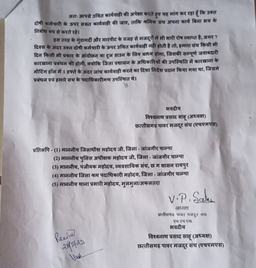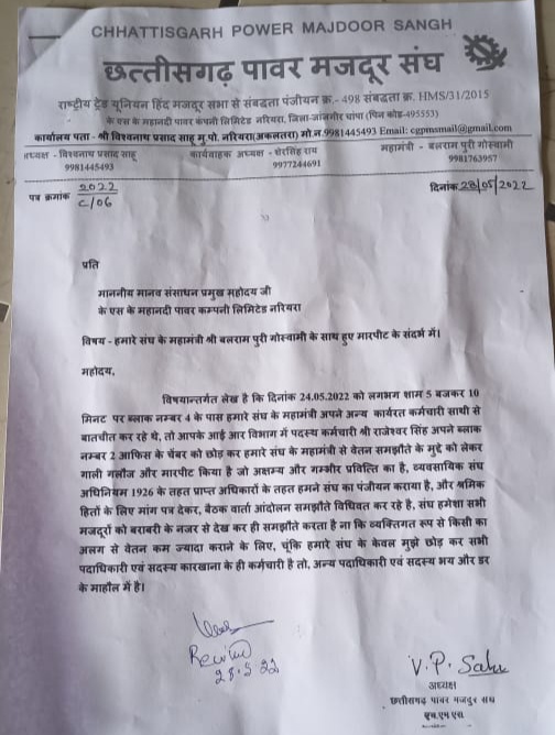 नरियरा। के एस के महानदी पावर कम्पनी लिमिटेड नरियरा में पंजीकृत श्रम संगठन छत्तीसगढ़ पावर मजदूर संघ (एचएमएस) यूनियन के महामंत्री बलराम गोस्वामी के साथ हुए मारपीट के विरोध में दोषी कर्मचारी के विरुद्ध सख्त कार्यवाही करने की मांग को लेकर ज्ञापन सौंपा गया, जिसमे प्रबंधन को 7 दिवस के अंदर कार्यवाही करने की चेतावनी दी गई है, संघ ने कार्यवाही नही करने की स्थिति में आंदोलन की चेतावनी भी दिया है।