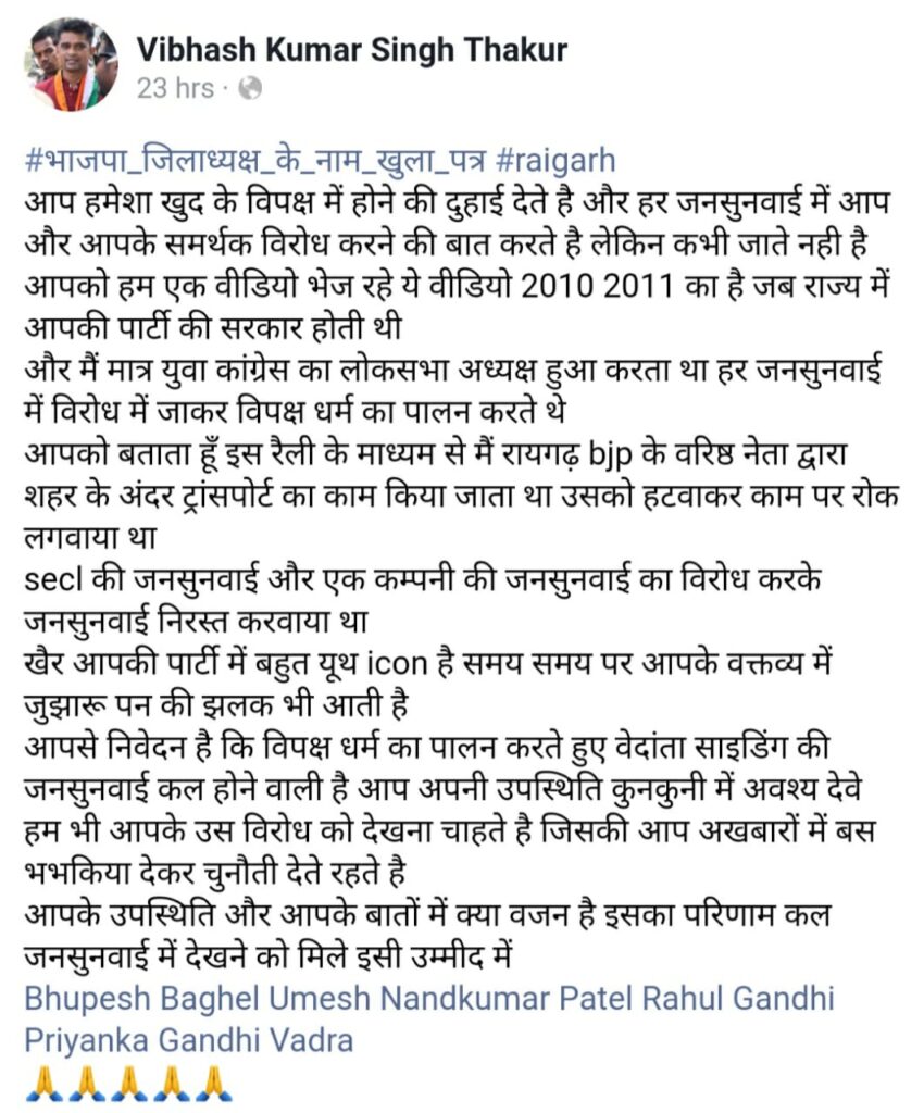 उल्लेखनीय है की उमेश अग्रवाल के भाजपा जिलाध्यक्ष बनने के बाद,यह बात खुलकर सामने आने लगी थी।की इस दफ़ा भाजपा ने उद्योगपति जिलाध्यक्ष चुना है।और यह चर्चा और भी आम होने लगी, जब उमेश ने उद्योगों की ज्यादतियों पर कभी भी खुलकर आवाज बुलंद नही किया। इस दरमियान दर्जनों जनसुनवाईयां आयोजित की गई,लेकिन भाजपा जिलाध्यक्ष ने कभी भी खुलकर इसका विरोध नही किया।बढ़ते औद्योगिकरण और प्रदूषण को लेकर उमेश कभी भी गंभीर नजर नही आये। इन्ही बातों को लेकर विभाष सिंह ने उमेश अग्रवाल को ललकारते हुए सोशल मीडिया में एक वीडियो डालते हुए उनके नाम खत लिखा है।और कहा है की भाजपा सरकार के कार्यकाल के दौरान होने वाली जनसुनवाई में वे(विभाष)किस तरह सैकड़ों लोगों को लेकर जनसुनवाई का विरोध करते थे।उनके विरोध की वजह से ही कई जनसुनवाई उस दौरान निरस्त भी हुई है।विभाष ने अंत मे निवेदन करते हुए लिखा है की अब कम से कम विपक्ष धर्म का पालन करते हुए थोड़े संजीदा हो जाइए।