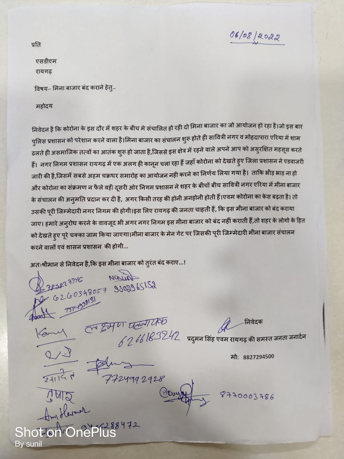 को बंद कराने व अनुमति दिये जाने के गोरख धंधे की हाई लेबल जांच करायें जाने की मांग की हैं यदि निगम व्दारा अनुमति रद्द नहीं की गयी तो मीना बाजार के बाहर गेट पर चक्का जाम किये जाने की चेतावनी दी गयी हैं जनहित में दोनो मीनाबाजार के संचालन को बंद किया जाना निहायत जरुरी व आवश्यक हैं जिस पर तत्काल कार्यवाही किये जाने की जरुरत हैं।