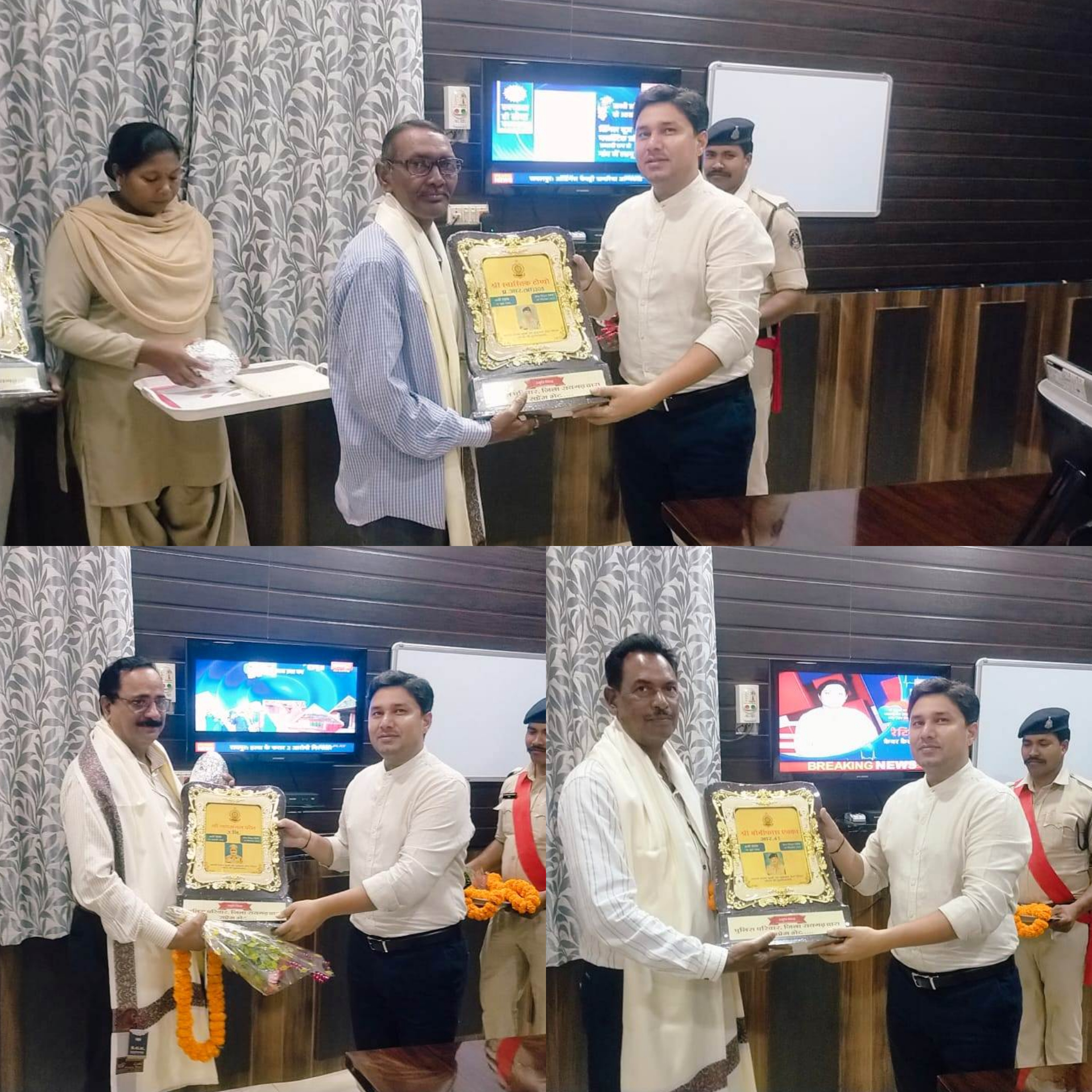 *रायगढ़* । आज दिनांक 30.09.2022 को पुलिस विभाग में सेवारत रहे सहायक उपनिरीक्षक जय मंगल पटेल, प्रधान आरक्षक चालक स्वास्तिक टोप्पो तथा आरक्षक बोनीफास एक्का अपनी अधिवार्षिकी आयु 62 वर्ष पूर्ण करने उपरांत जिला पुलिस बल रायगढ़ से सेवानिवृत्त हुए । विभागीय परंपरा अनुसार सेवानिवृत्ति के लिए पुलिस कार्यालय में सेवा सम्मान कार्यक्रम रखा गया था जिसमें पुलिस अधीक्षक श्री अभिषेक मीना द्वारा उन्हें लंबी सेवा के लिए विभाग की ओर से कृतज्ञता प्रकट कर शॉल, श्रीफल, मोमेंटो भेंट कर सम्मान किया गया तथा उन्हें स्वस्थ व दीर्घायु की शुभकामनाएं दिए । एसपी श्री मीना सेवानिवृत्तों के पेंशन व देय अन्य स्वत्वों के संबंध में प्रभारी मुख्य लिपिक से जानकारी लेकर सेवानिवृत्तों से कहा गया कि विभागीय व निजी किसी भी प्रकार की समस्या आवें तो निसंकोच संपर्क करें । कार्यक्रम में सेवानिवृत्त के परिवार के सदस्य भी उपस्थित थे ।