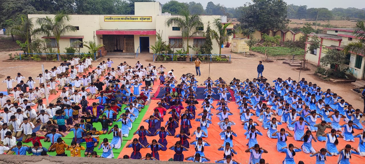 रायगढ़ :- आयुष संचालक एवं आईएएस पी दयानंद के आदेश अनुसार एवं डॉक्टर मीरा भगत जिला आयुर्वेद अधिकारी रायगढ़ के मार्गदर्शन में आयुष हेल्थ एंड वैलनेस सेंटर बुनगा के प्रभारी आयुर्वेद विशेषज्ञ डॉ अजय नायक के तत्वाधान में कुशल योग प्रशिक्षक दुला मणि रजक के द्वारा हायर सेकेंडरी स्कूल बड़े भंडार में एक दिवसीय योगाभ्यास का आयोजन किया गया l आयोजन में चार सौ से अधिक स्कूली छात्र छात्राओं ने भाग लिया l आयोजन के दौरान योग से जुड़े विभिन्न आसान योग की विधि सहित भ्रामरी भ्रस्तिका कपाल भांति अनुलोम विलोम ओम का उच्चारण सहित विभिन्न प्रकार के आसनों में शवासन मकरासन भुजंगासन वज्रासन पवनमुक्तासन उष्ट्रासन चक्रासन