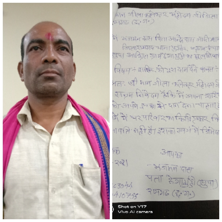 इसी कड़ी में पुसौर क्षेत्र के ग्राम ठेंगागुड़ी के भजमन दास ने भी कल देवकी रामधारी फाउंडेशन के दीपक डोरा से मुलाकात कर देहदान करने का फैसला लिया है।बता दें की भजमन दास के मन मे देहदान करने की इच्छा काफी दिनों से थी।कल भजमन दास ने कलेक्ट्रेट पहुंचकर वहां अतिरिक्त कलेक्टर से मुलाकात कर उन्हें अपनी इच्छा से अवगत कराया,जिसपर उन्हें बताया गया की देवकी रामधारी फाउंडेशन के दीपक डोरा से मुलाकात कर देहदान की प्रक्रिया पूरी करें। तदुपरांत भजमन दास ने दीपक डोरा से मिलकर देहदान की प्रक्रिया को पूरा किया गया।