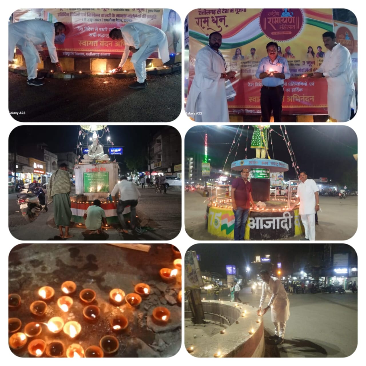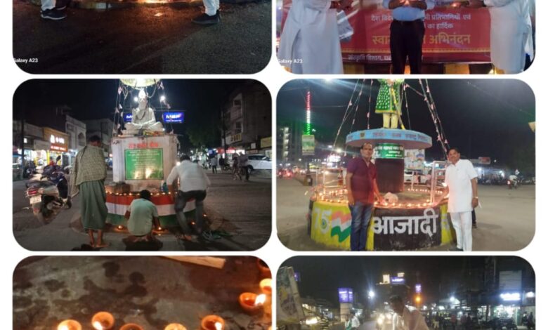 तकरीबन 7 बजे शहर के कबीर चौक ,मिनीमाता चौक, सुभाष चौक, शहीद चौक, रामनिवास चौक, चक्रधर नगर, सिग्नल चौक, घड़ी चौक, सत्तिगुडी, रेलवे स्टेशन, अंबेडकर नगर, केवड़ा बाड़ी, हंडी चौक और ढिमरापुर चौक में दीप प्रज्वलित किए गए। दीप प्रज्वलित कार्यक्रम में उत्साहित कार्यकर्ताओं के साथ-साथ शहर के गणमान्य नागरिक एवं स्वयं जिला कोषाध्यक्ष शंकरलाल अग्रवाल, रामलीला समिति के संरक्षक दीपक पांडेय, वरिष्ठ कांग्रेश नेता मनोरंजन नायक, सूरज उपाध्याय, भरत तिवारी,अनिल प्रधान, सत्यम पंडा , सतीश निषाद पितांबर महंत, संतोष, रोशन यादव, सूर्या कान्त, हरिशंकर पाल, अरविंद ,ठंडा राम प्रधान, रमेश, देवेश ऑगरे , सहित बड़ी संख्या में अन्य नागरिक शामिल हुए।