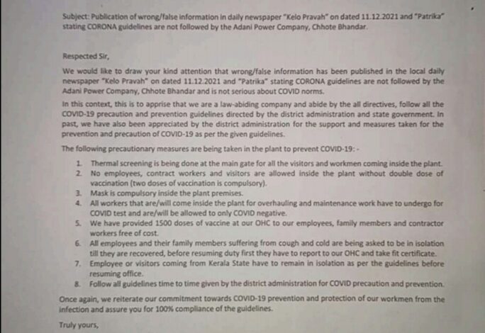 कंपनी ने अपने पत्र में कलेक्टर को गलतफहमी फैलाने वाले कुछ समाचारों को ख़ारिज करते हुए और उन्हें भरोसा दिलाया है की वह कोविड की रोक को लेकर जागृत और प्रतिबद्ध है। कंपनी ने रायगढ एनर्जी जनरेशन लिमिटेड द्वारा जो एहतियात लि जा रही है उसके प्रमाण भी जिला कलेक्टर के साथ साझा किये है।