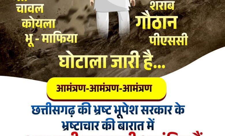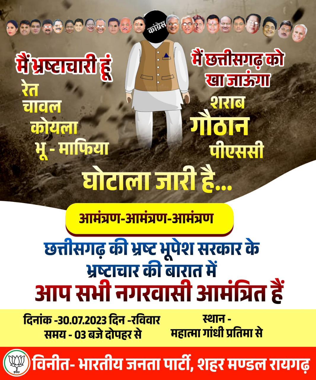 नगर मंडल महामंत्री सुमित शर्मा एवं मनोज शर्मा ने रायगढ़ जिले व शहर के समस्त नागरिकों एवं कार्यकर्ताओं से विनम्र निवेदन है कि वे इस भ्रष्टाचार रूपी घोटालों की बारात में सम्मिलित होकर भूपेश सरकार का पुतला दहन में सहभागी बनें।