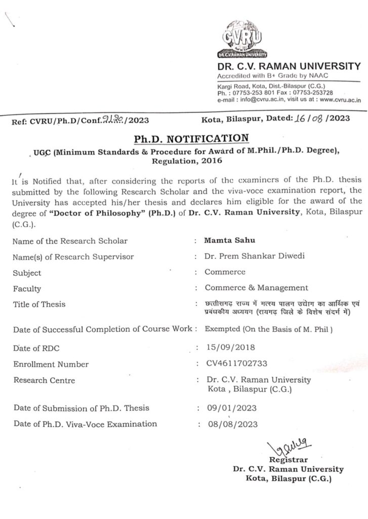 मत्स्य पालन उद्योग का आर्थिक एवं प्रबंधकीय अध्ययन “रायगढ़ ज़िले के विशेष संदर्भ में” विषय में डॉ. प्रेमशंकर द्विवेदी के मार्गदर्शन में पीएचडी की उपाधि हासिल कर समाज व जिले का नाम रोशन किया है। उन्होंने बताया कि पीएचडी की उपाधि प्राप्त करने के बाद अपनी आगे की पढ़ाई जारी रखेगी।