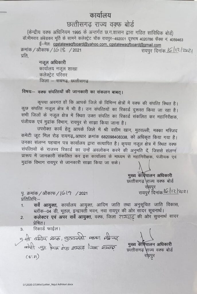 जूटमिल सुन्नी मक्का मस्जिद के मुतवल्ली (सदर) वसीम खान को अधिकृत किया गया है। जिन्हें यह जिम्मेदारी दी गई है वे जिले भर के वक्फ की नजूल क्षेत्र में स्थित सम्पत्तियों का रिकार्ड संकलित कर नजुल विभाग से दस्तावेज हेतु रिकार्ड संकलित कर राज्य वक्फ बोर्ड को प्रेषित करेंगे। जिले भर के वक्फ की नजूल सम्पत्तियों की जानकारी रिकार्ड संकलित कर महानिरीक्षक पंजीयक एवं मुद्रांक विभाग रायपुर को भेजा जाना है। ताकि प्रदेश भर के वक्फ की नजूल सम्पत्तियों को सुरक्षित किया जा सके।