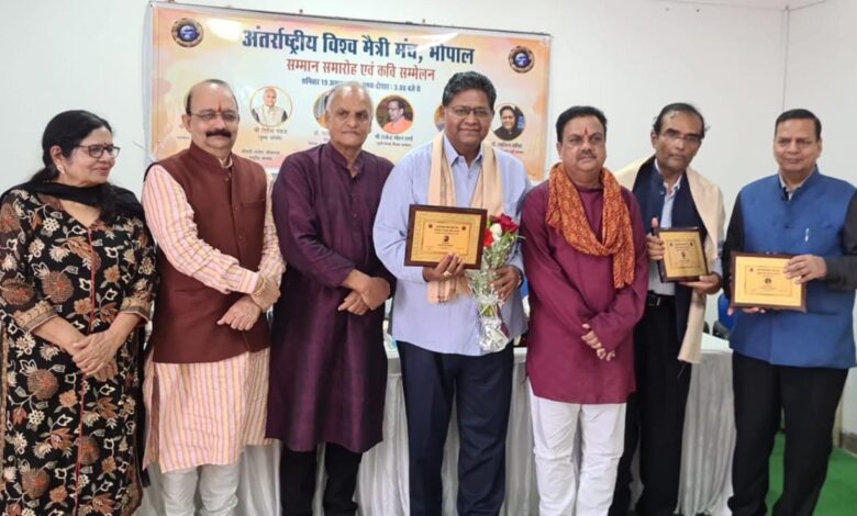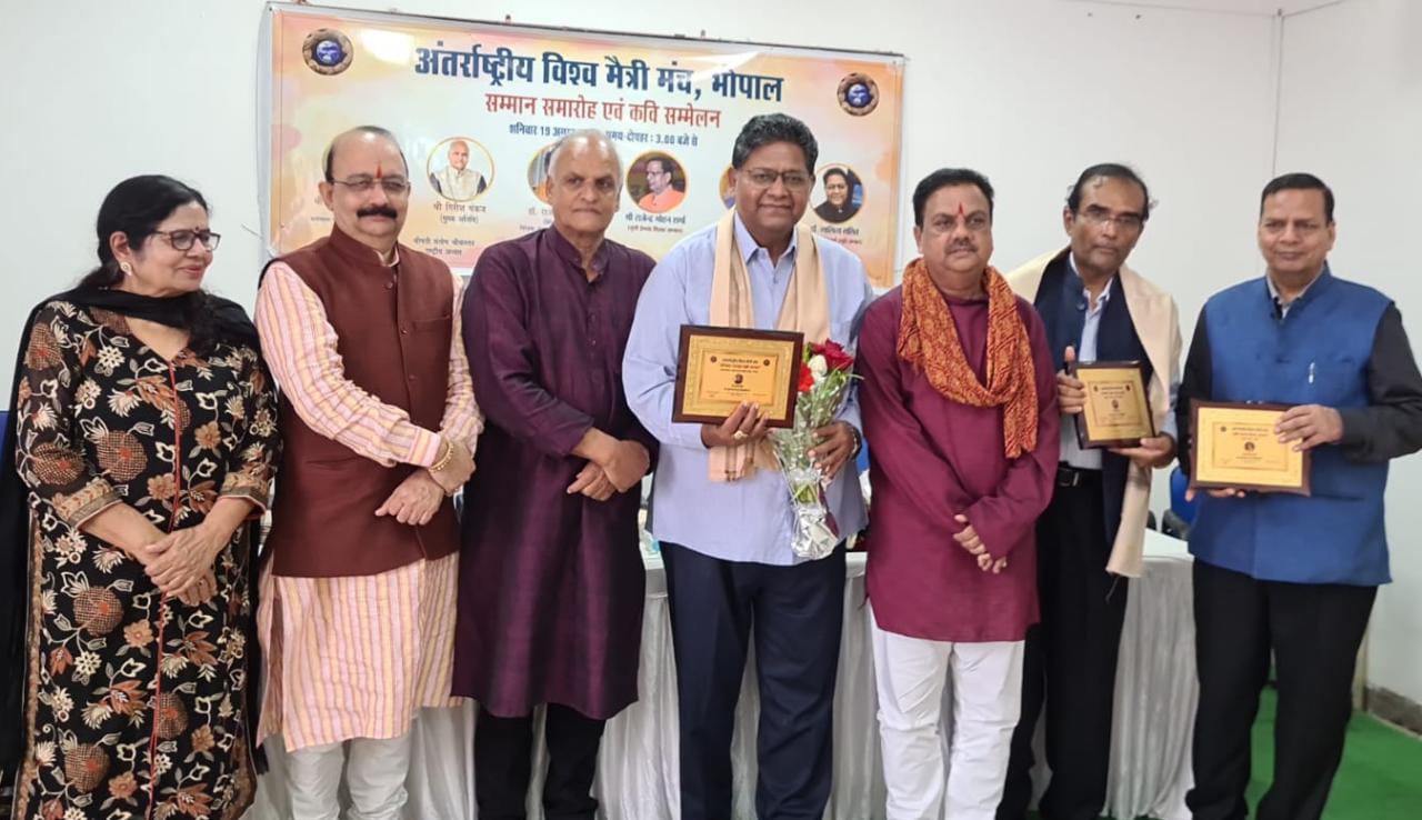 भोपाल:- हिंदी भवन भोपाल में देश की राजधानी दिल्ली के व्यंग्यकार डॉक्टर लालित्य ललित को अंतर्राष्ट्रीय विश्व मैत्री मंच की ओर से हरिशंकर परसाई स्मृति सम्मान दिया गया। यह सम्मान वरिष्ठ व्यंग्यकार गिरीश पंकज एवम हिंदी भवन के अध्यक्ष रास बिहारी गोस्वामी के साथ संस्था की अध्यक्ष कथाकार संतोष श्रीवास्तव ने प्रदान किया।
