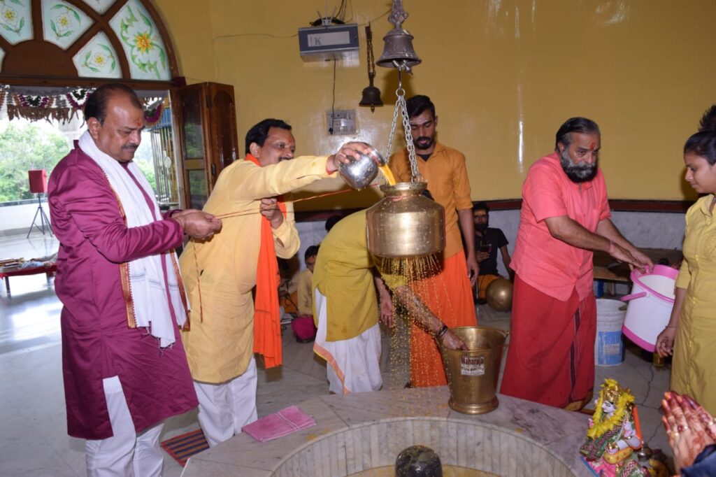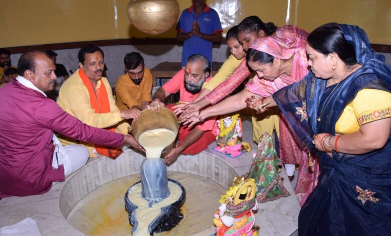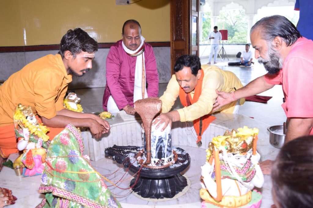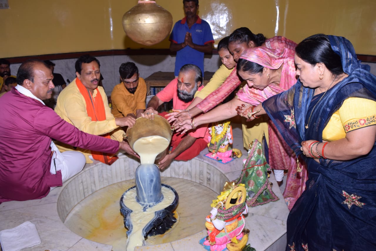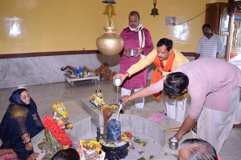 रायगढ़ – जिला मुख्यालय से 5 किलोमीटर पर स्थित मनकामेश्वर मंदिर में भाजपा कार्यकर्ता एवं रामदास द्रौपदी फाउंडेशन के चेयरमैन सुनील रामदास ने रूद्राभिषेक किया। मंदिर के पुजारी बाबा राम सिंह और 11 पुरोहितों द्वारा विधि विधान से भाजपा नेता सुनील रामदास के साथ नगर के प्रतिष्ठित व्यापारी राजकुमार अग्रवाल (गोड़म) व अनूप बंसल और कई मातृशक्ति को रुद्राभिषेक कराया गया। इस विषय पर सुनील रामदास ने बताया कि सनातन हिन्दू जीवन पद्धति में श्रावण माह का विशेष महत्त्व होता है। क्योंकि इस माह में धरती का रंग हरा हो जाता है। इसका कारण यह है कि इस माह में