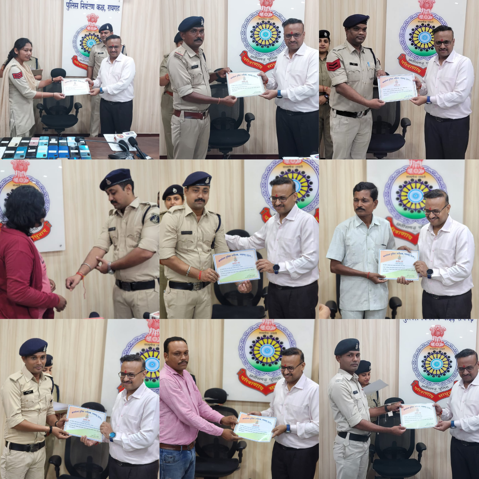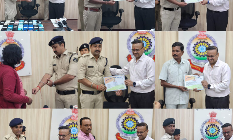 *रायगढ़* । आज दिनांक 29/08/2023 को पुलिस कंट्रोल रूम में मोबाइल वितरण कार्यक्रम दौरान जिले के 13 पुलिसकर्मियों को उनके उत्कृष्ट कार्य के लिए पुलिस उप महानिरीक्षक रायगढ़ रेंज, रायगढ़ श्री राम गोपाल गर्ग एवं वरिष्ठ पुलिस अधीक्षक रायगढ़ श्री सदानंद कुमार द्वारा प्रशस्ति पत्र देकर उन्हें शुभकामनाएं दिया गया और आगे भी बेहतर कार्यों के लिए प्रोत्साहित किया गया ।