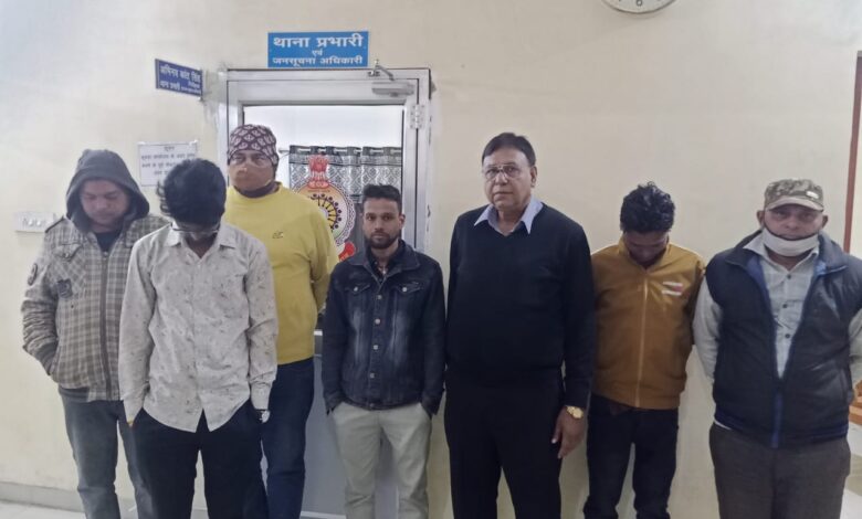 रायगढ़। दिनांक 22/122021 के शाम चक्रधरनगर थाना प्रभारी निरीक्षक अभिनवकांत सिंह को मुखबिर से सूचना मिला कि ग्राम जुर्डा इको पार्क में कुछ जुआडियान 52 पत्ते ताश से जुआ खेलने बैठे हैं । थाना प्रभारी द्वारा मुखबीर सूचना पर थाने से पुलिस बल रेड कार्रवाई के लिये रवाना किया गया, पुलिस टीम की घेराबंदी देख कुछ जुआडियान पुलिस को देखकर इधर-उधर भागे पुलिस टीम द्वारा जुआ फड के पास से जुआ खेलते 07 जुआरियान 1- ओम प्रकाश पुरसेठ पिता स्वर्गीय कमल कांत पुरसेठ उम्र 42 वर्ष निवासी मधुबनपारा रायगढ़ 2- विजेंद्र सिंह ठाकुर पिता स्वर्गीय रामचंद्र ठाकुर उम्र 39 वर्ष कोष्टपारा रायगढ़ 3- रमेश शर्मा पिता स्वर्गीय मुंशीराम शर्मा उम्र 49 वर्ष कोष्टपारा रायगढ़ 4- अंकित बानी पिता कालीचरण बानी उम्र 25 साल गांजा चौक रायगढ़ 5- प्रहलाद गुप्ता पिता नंद किशोर गुप्ता उम्र 29 साल गांजा चौक रायगढ़ 6- कमल सिंह पिता डी.एल.सिंह उम्र 39 वर्ष रामनिवास चौक रायगढ़ 7- सुरेश कुमार पिता एम. एल. अग्रवाल उम्र 54 वर्ष गौरी शंकर मंदिर रोड रायगढ़ पर थाना चक्रधरनगर पकड़े गये ।