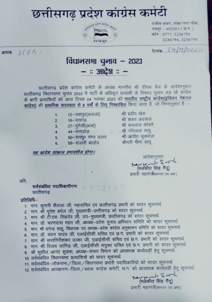 रायगढ़…रायगढ़ विधानसभा से पार्टी से बगावत कर निर्दलीय चुनाव लड़ रहे कांग्रेस के कोषाध्यक्ष शंकरलाल अग्रवाल को कांग्रेस प्रदेश अध्यक्ष ने पार्टी से बाहर का रास्ता दिखाया है।प्रदेशाध्यक्ष दीपक बैज ने आज उन्हे छह साल के लिए निष्कासित कर दिया है।