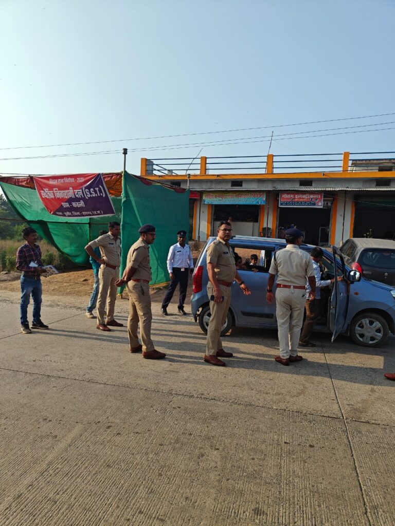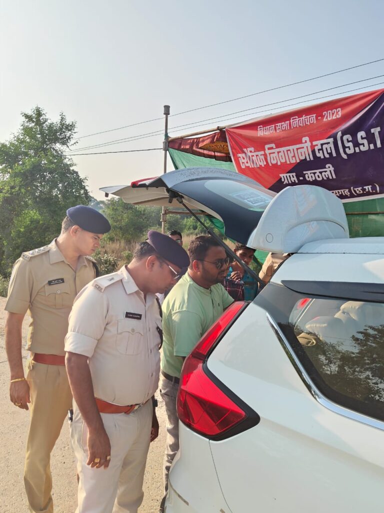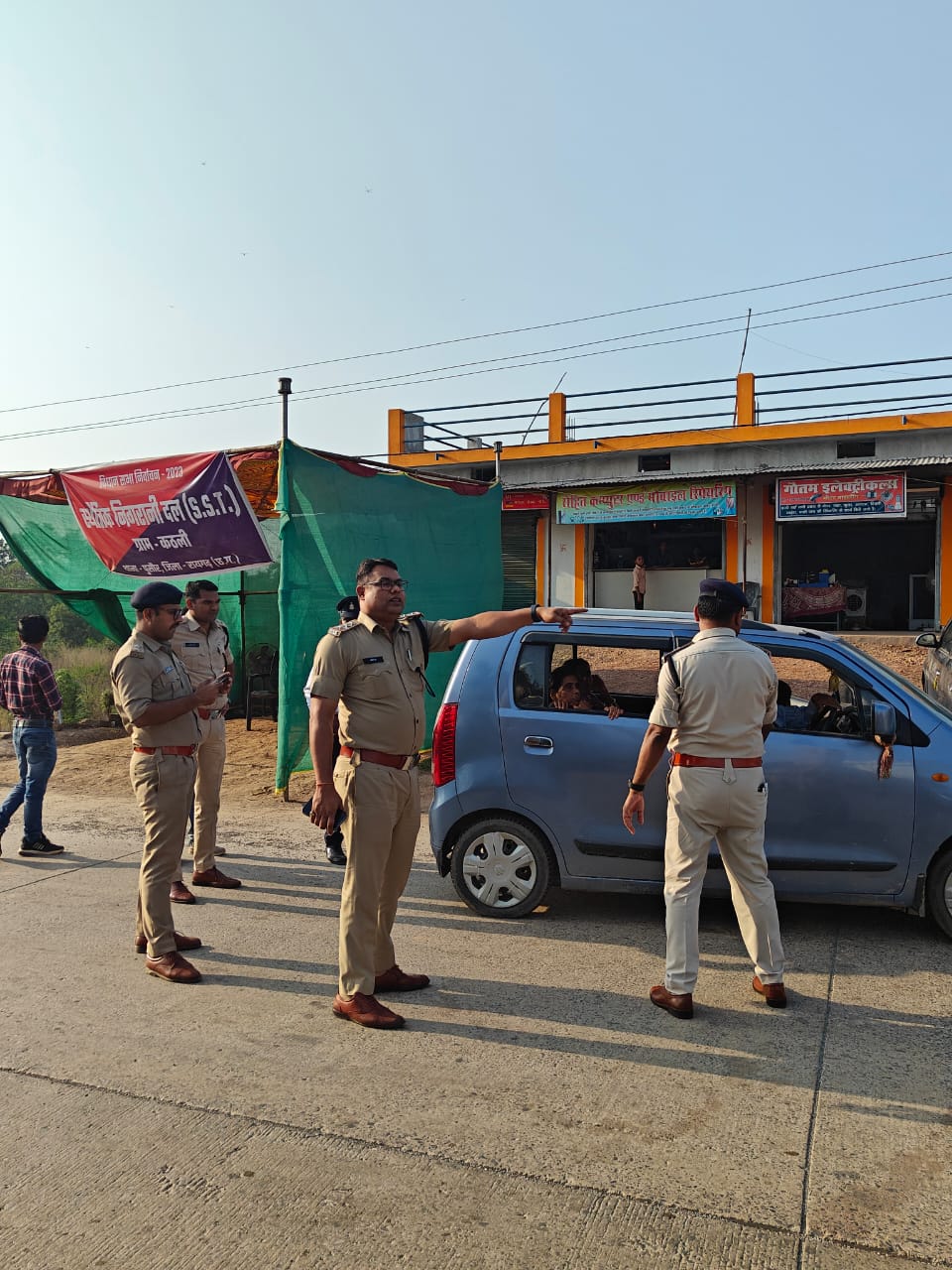 *रायगढ़* । वरिष्ठ पुलिस अधीक्षक श्री सदानंद कुमार के दिशा निर्देशन पर आज दिनांक 07.11.2023 के दोपहर एडिशनल श्री एसपी संजय महादेवा के साथ एसडीओपी धरमजयगढ़, एसडीओपी खरसिया, ट्रैफिक डीएसपी, प्रशिक्षु डीएसपी एवं नगर कोतवाल ने जिले के रायगढ़ विधानसभा क्षेत्र अंतर्गत आने वाले चेक पोस्ट कठली, लारा, बडमाल, एकताल का औचक निरीक्षण किया गया । निरीक्षण के दौरान ग्राम कठली पर तैनात SST टीम के साथ अधिकारियों ने वाहनों की जांच में शामिल होकर आने-जाने वाले वाहनों को चेक कर रिकॉर्ड हेतु संधारित रजिस्टर को चेक किया गया । एडिशनल एसपी तथा अधिकारियों ने स्थैतिक निगरानी दल (SST Team) के कर्मचारियों को आवश्यक दिशा निर्देशित करते हुए चेक पोस्ट पर वाहनों की बारीकी से जांच करने और आदर्श आचरण संहिता के अनुसार किसी भी चुनाव प्रभावित सामग्रियों के मिलने पर तत्काल अधिकारियों को सूचना देने के निर्देश दिए गए ।
