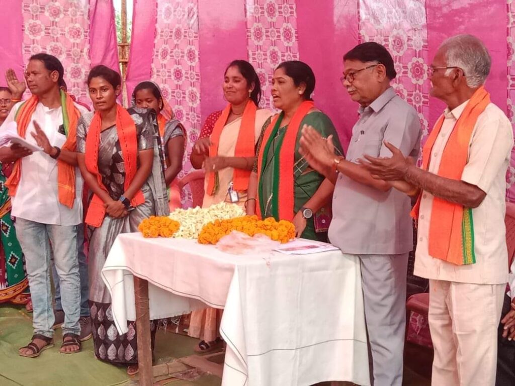 रायगढ़:-लैलूंगा विधान सभा स्थित संबलपुरी मंडल के ग्राम जुनवानी में भाजपा नेत्रीश्रीमती सुषमा खलखो के नेतृत्व में मोदी सरकार की नीतियों से प्रभावित होकर सौ बहनों ने भाजपा प्रवेश किया। एक नुक्कड़ सभा के आयोजन के दौरान लैलूँगा विधान सभा प्रभारी एवम जिला भाजपा महामंत्री सतीश बेहरा वरिष्ठ नेता गोकूलानंद पटनायक के समक्ष सभी बहनों को सुषमा खलखो द्वारा गमछा पहना कर विधिवत पार्टी की की सदस्यता दी गई। सभी महिलाओ को महतारी वंदन योजना का लाभ बताया गया।इस दौरान सतीश बहरा ने महिलाओं को प्रोत्साहित करते हुए कहा भाजपा की विचारधारा राष्ट्रवादी है इससे जुड़कर देश की सेवा की जा सकती है।